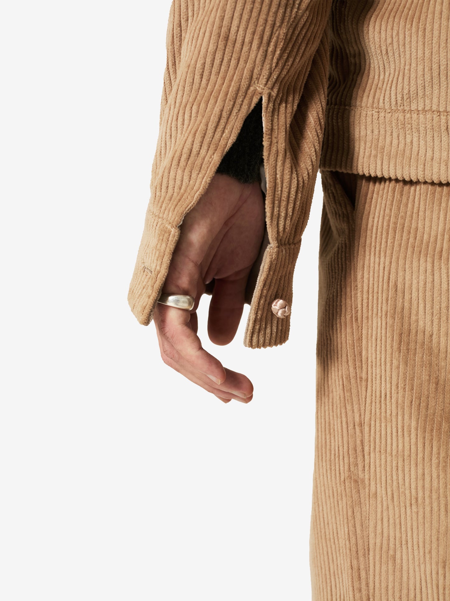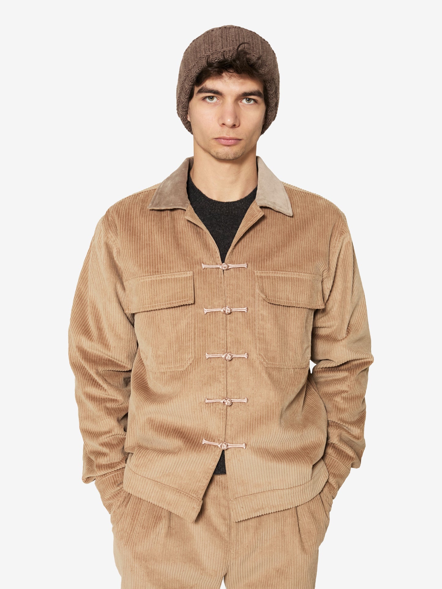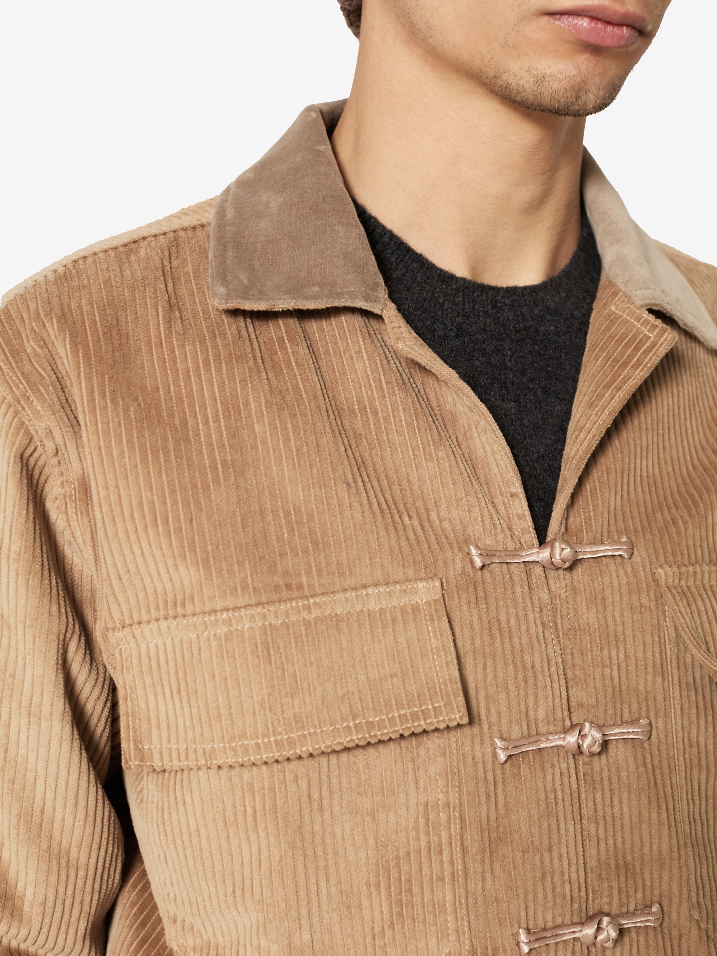 This corduroy jacket evokes a sense of heritage while remaining effortlessly modern. Its structured yet relaxed design features a unique handcrafted satin frog button closure, while the contrast velvet collar enhances its textural depth.