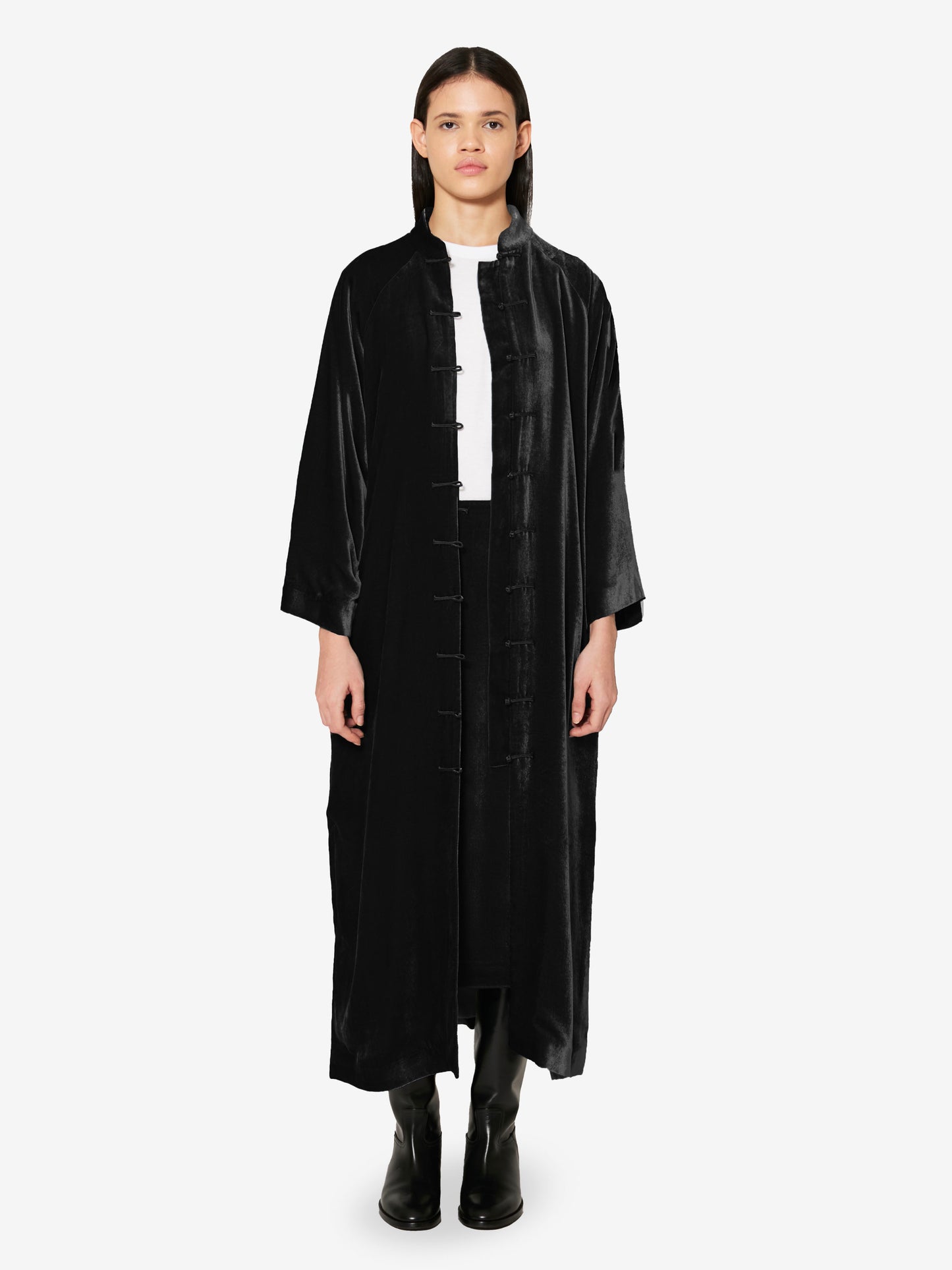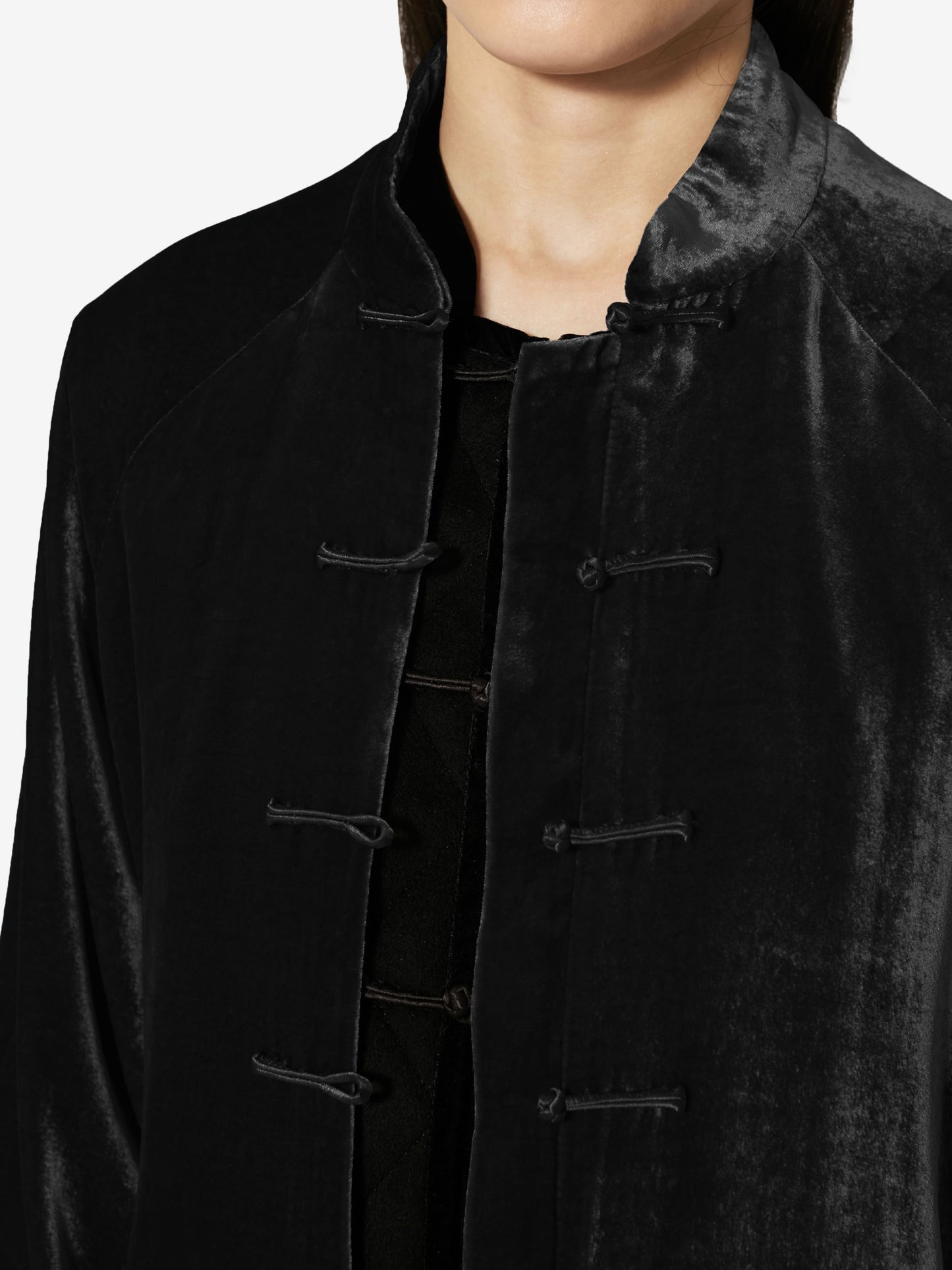 Sophisticated and timeless, this light coat is crafted from richly textured velvet. Featuring a handcrafted satin frog button closure, it evokes the refinement of past eras while remaining effortlessly modern. Flared sleeves and a raglan cut enhance its relaxed, flowing silhouette.