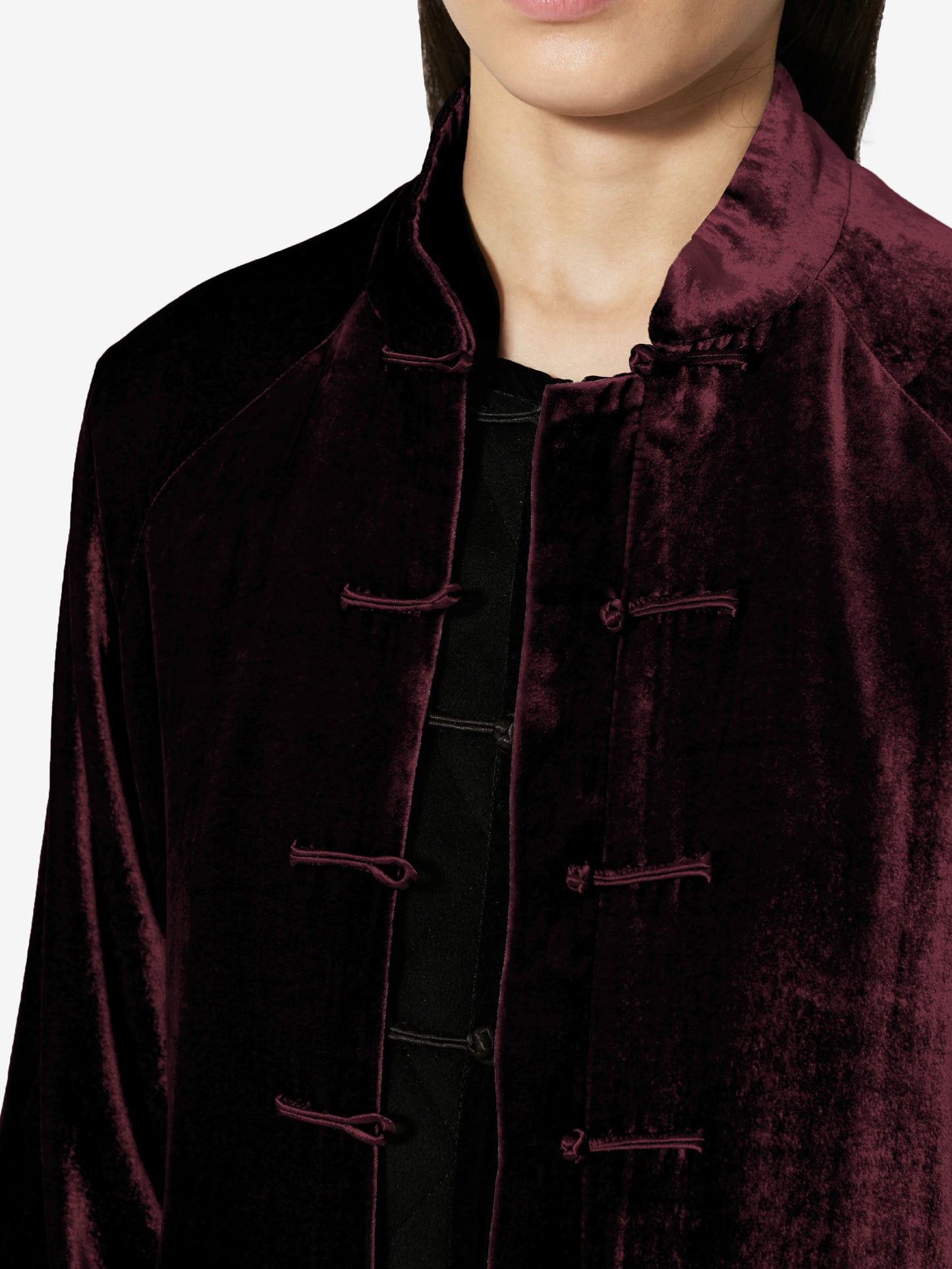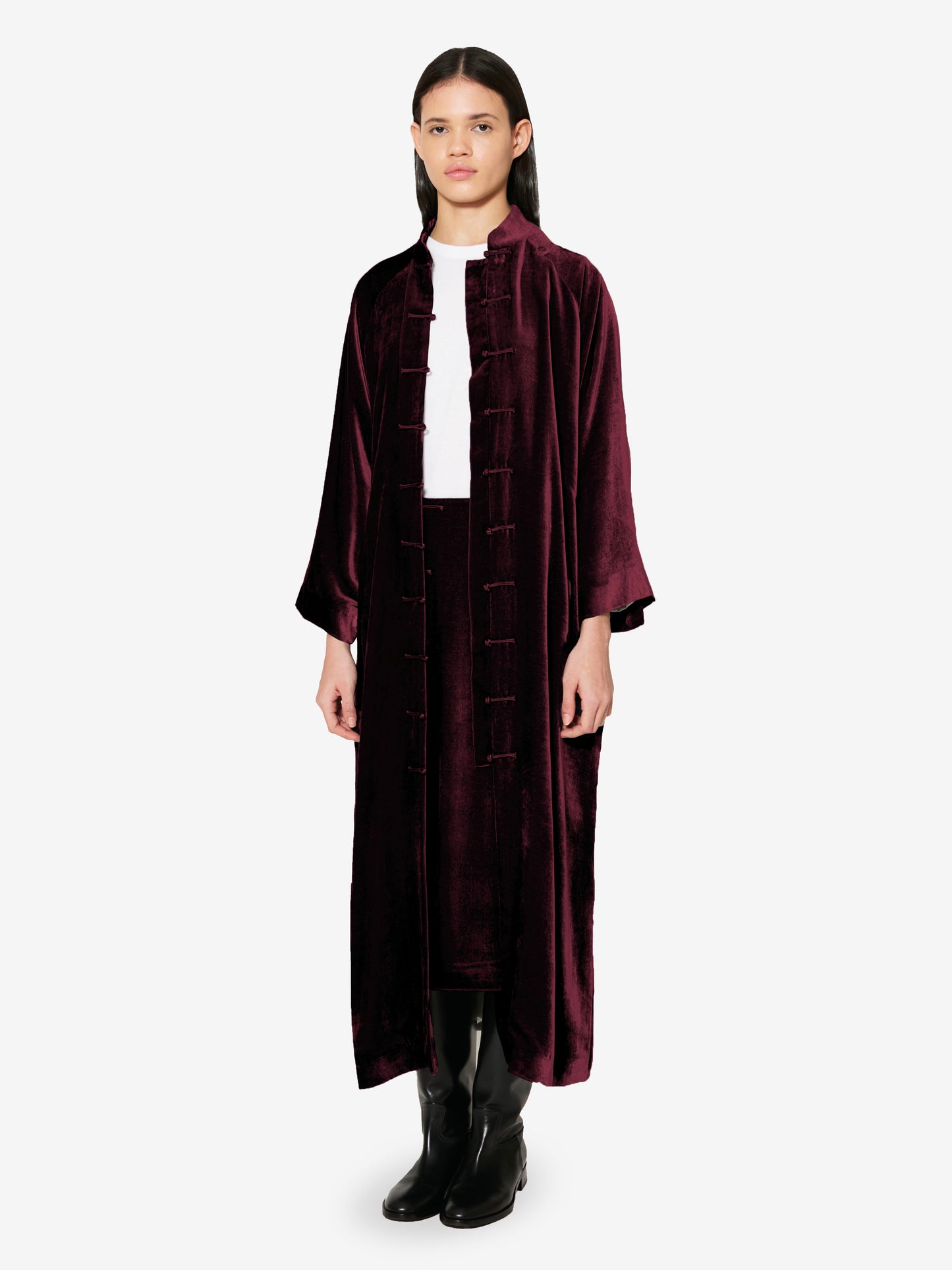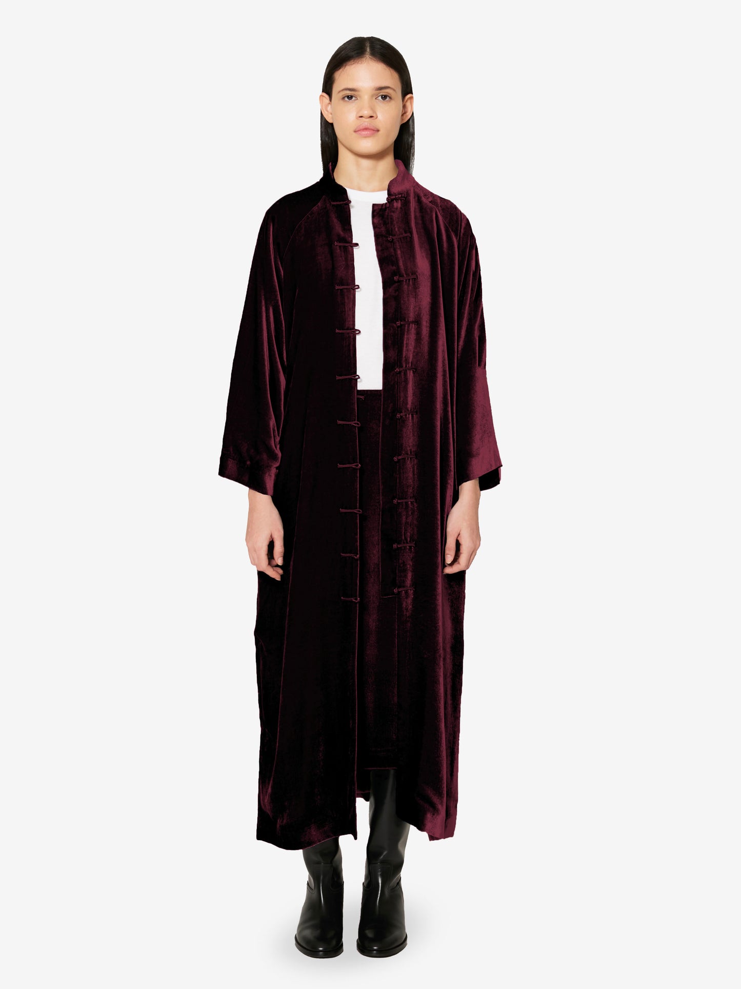Sophisticated and timeless, this light coat is crafted from richly textured velvet. Featuring a handcrafted satin frog button closure, it evokes the refinement of past eras while remaining effortlessly modern. Flared sleeves and a raglan cut enhance its relaxed, flowing silhouette.