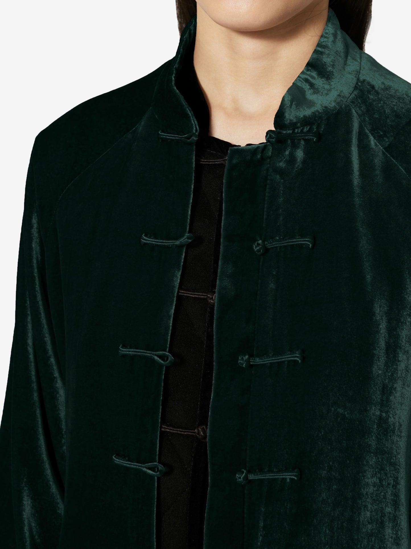 Sophisticated and timeless, this light coat is crafted from richly textured velvet. Featuring a handcrafted satin frog button closure, it evokes the refinement of past eras while remaining effortlessly modern. Flared sleeves and a raglan cut enhance its relaxed, flowing silhouette.