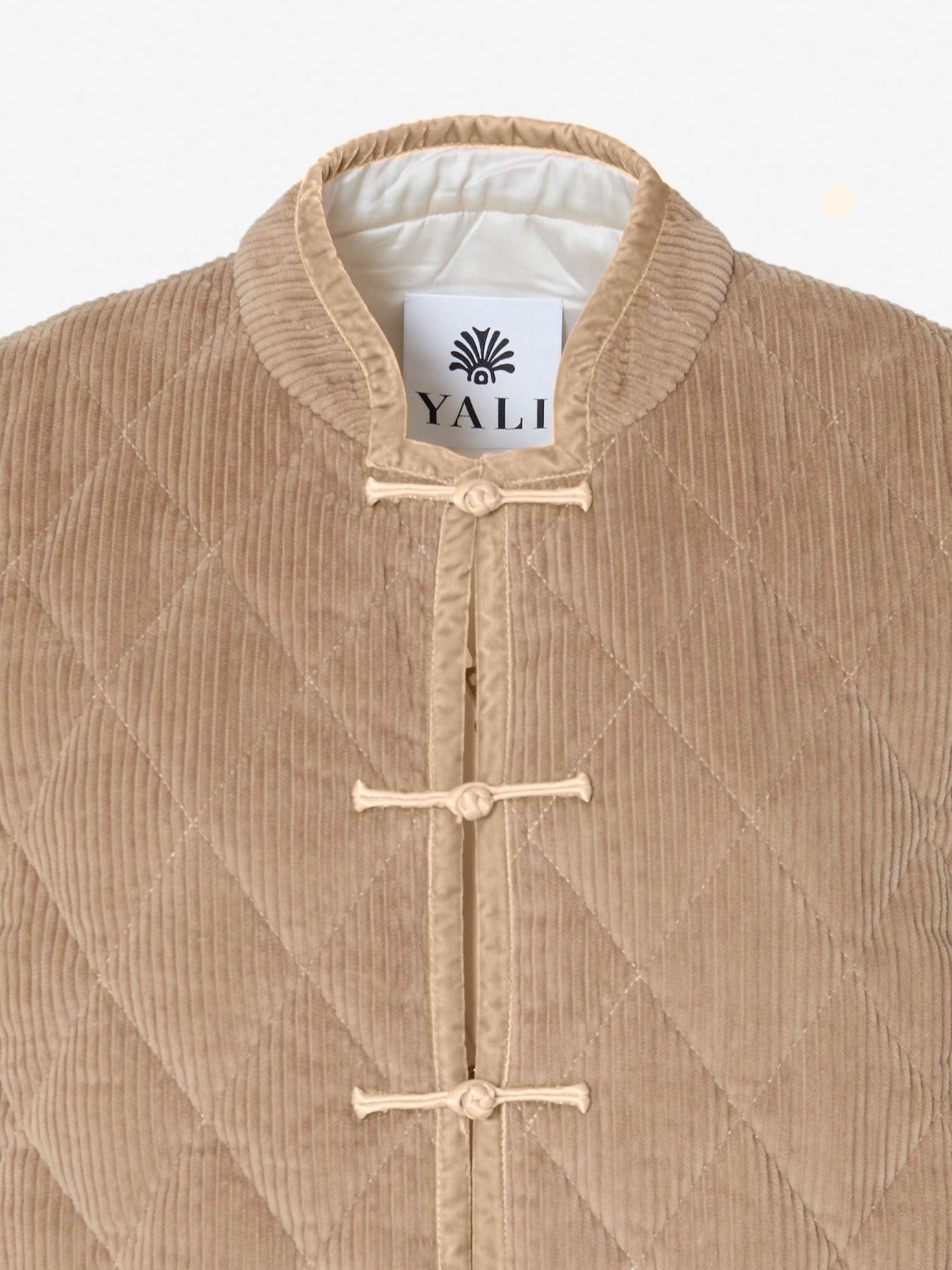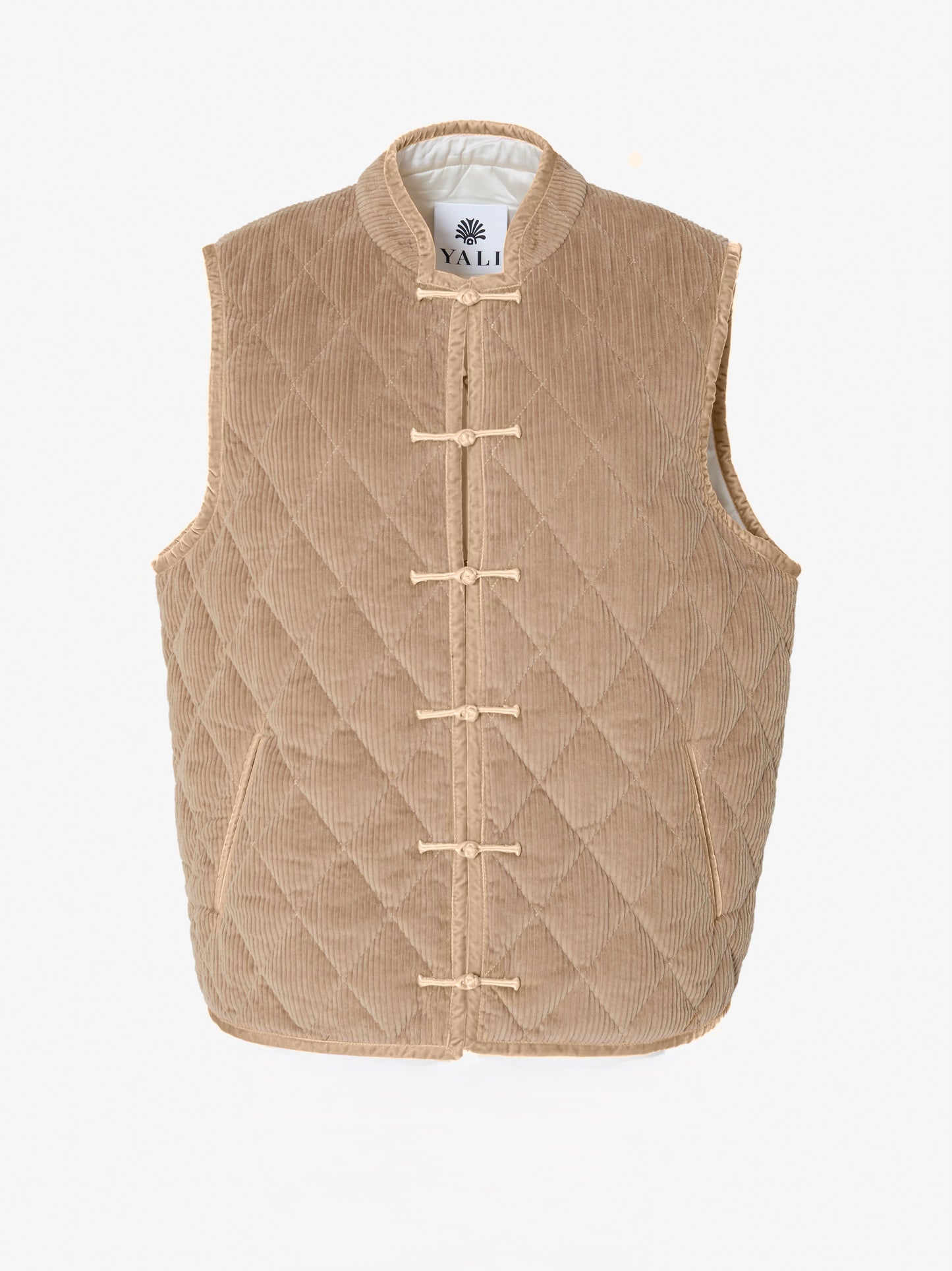 Relaxed and refined, this signature quilted vest features a handcrafted satin frog button closure and a rounded stand collar that frames the neckline with subtle structure. Its loose cut adds an effortless tone, making it both comfortable and versatile. A cold-season essential, it can be worn over a jacket or knit, or layered under a coat for extra warmth.