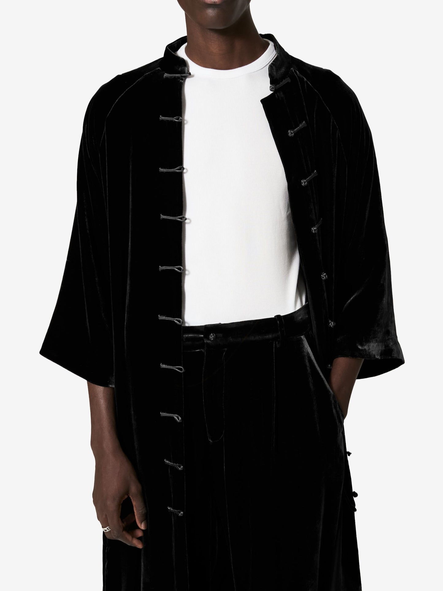 Sophisticated and timeless, this light coat is crafted from richly textured velvet. Featuring a handcrafted satin frog button closure, it evokes the refinement of past eras while remaining effortlessly modern. Flared sleeves and a raglan cut enhance its relaxed, flowing silhouette.