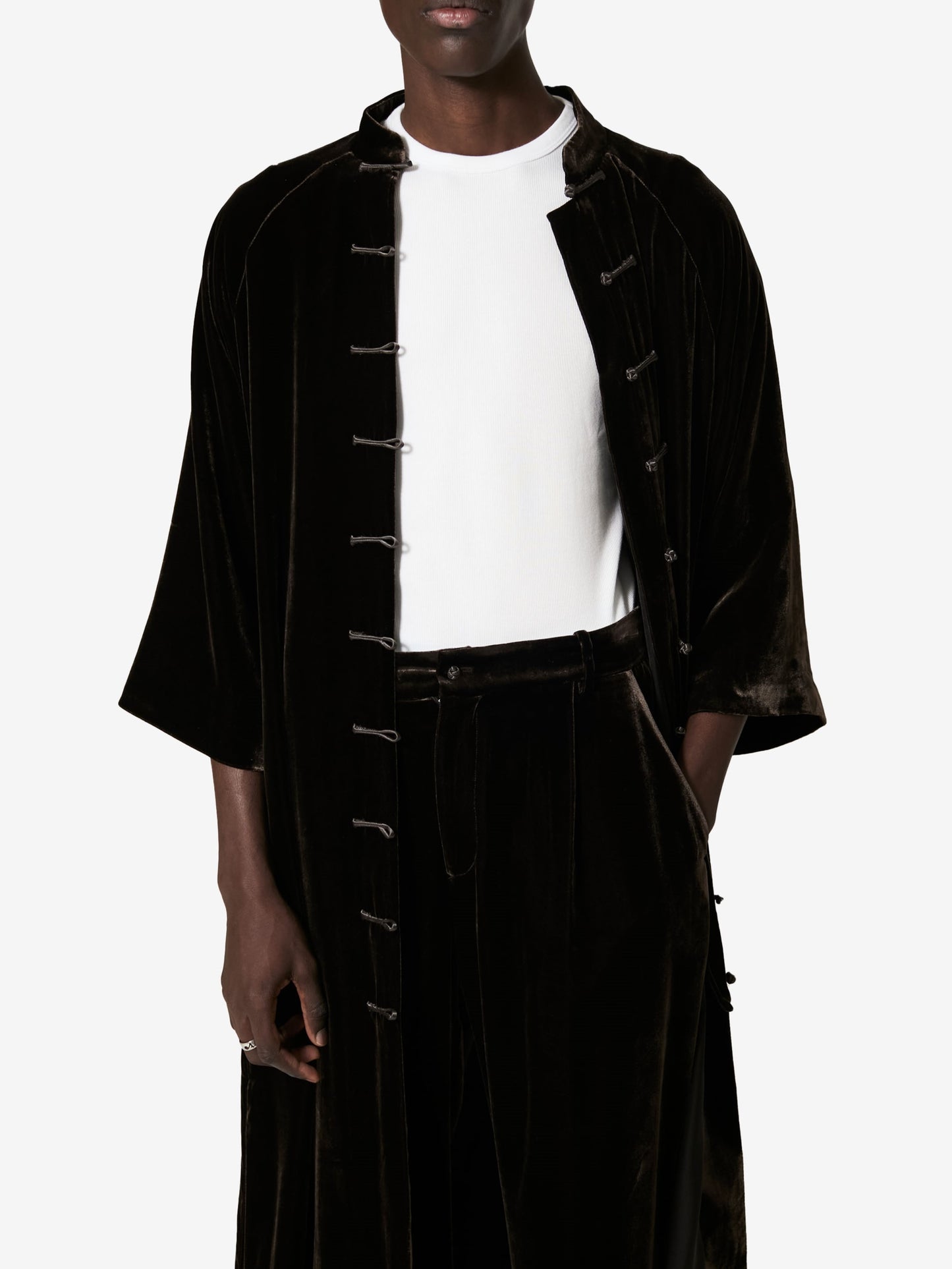 Sophisticated and timeless, this light coat is crafted from richly textured velvet. Featuring a handcrafted satin frog button closure, it evokes the refinement of past eras while remaining effortlessly modern. Flared sleeves and a raglan cut enhance its relaxed, flowing silhouette.