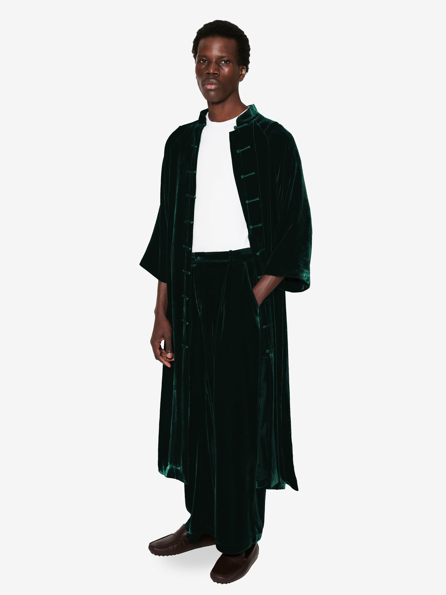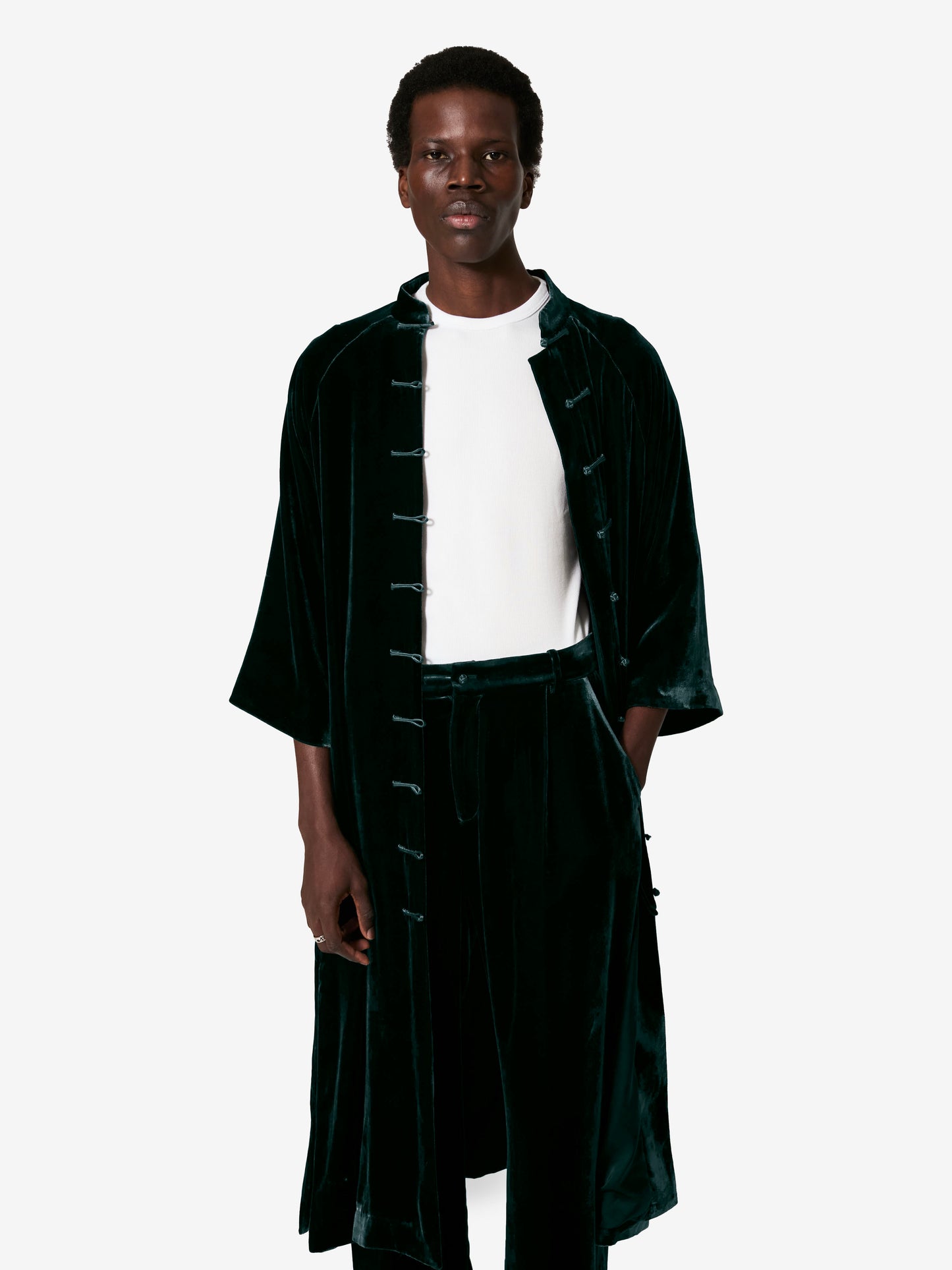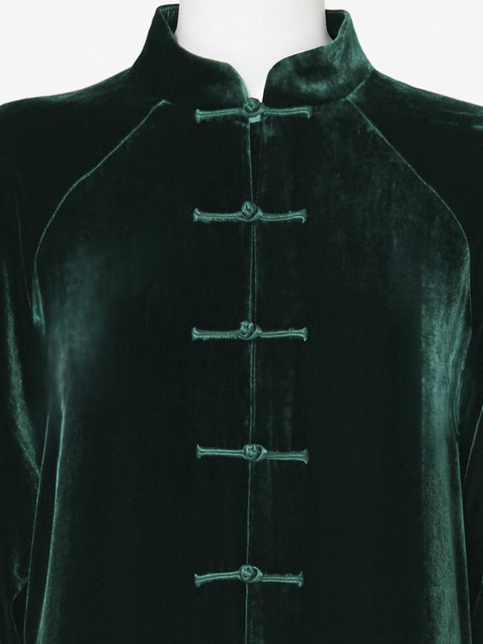 Sophisticated and timeless, this light coat is crafted from richly textured velvet. Featuring a handcrafted satin frog button closure, it evokes the refinement of past eras while remaining effortlessly modern. Flared sleeves and a raglan cut enhance its relaxed, flowing silhouette.