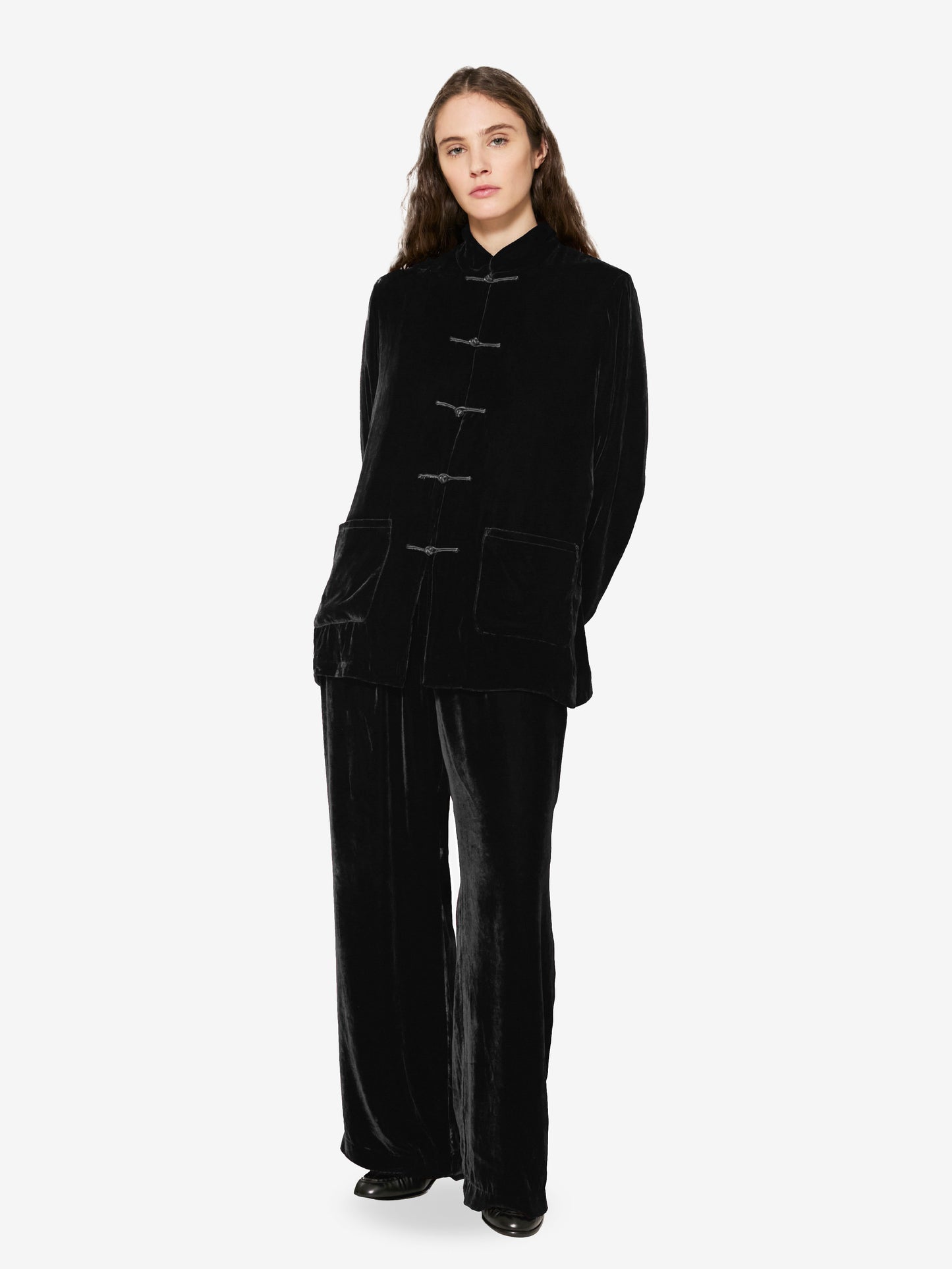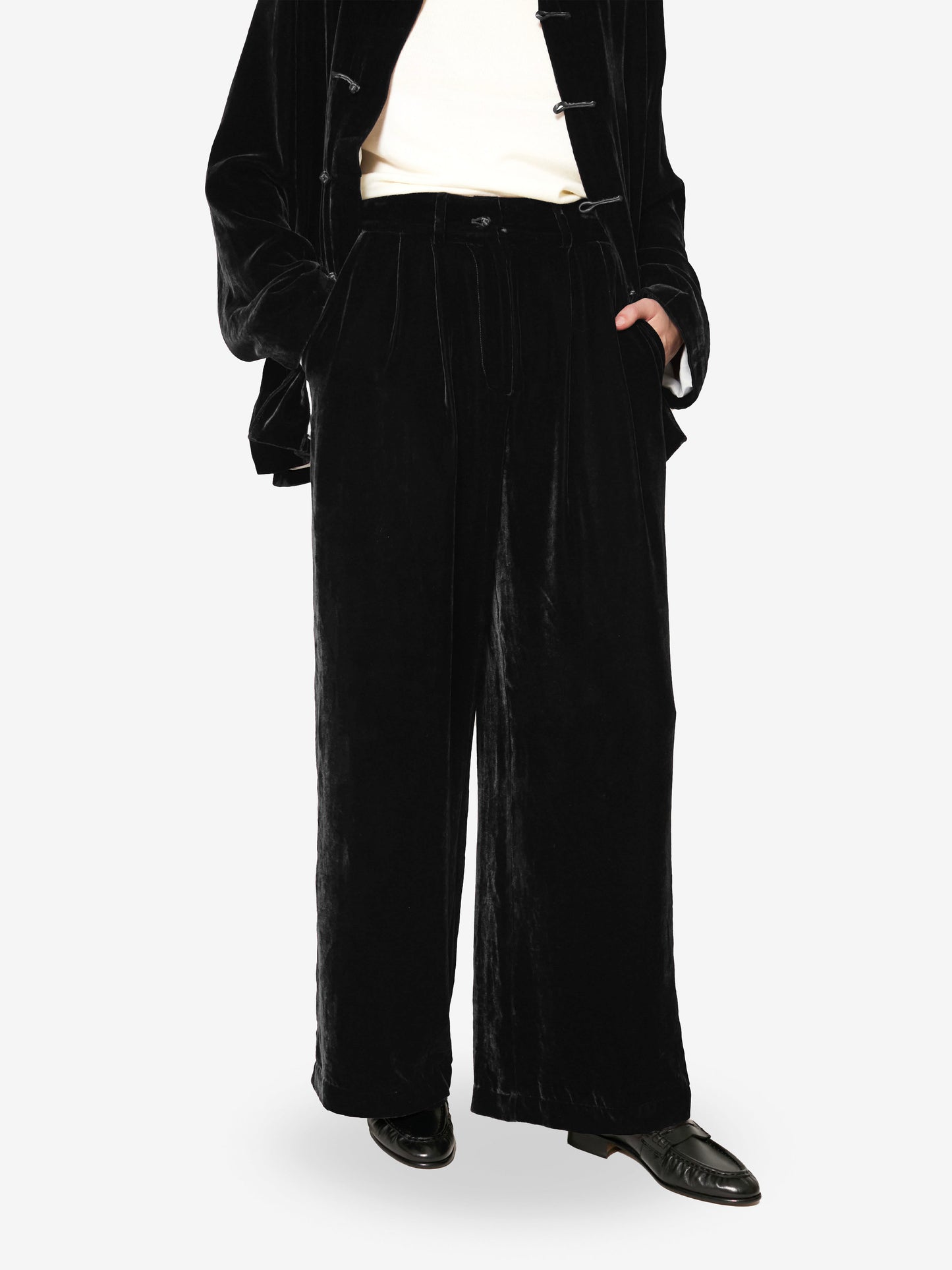 Crafted from richly textured velvet, the piece pairs effortlessly with both casual and elevated looks, whether styled with fluid shirting or knits. A true staple, designed for those who embrace enduring comfort, quiet strength, and intentional simplicity.