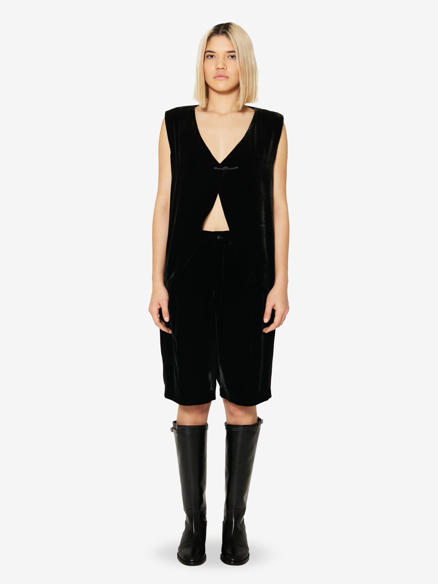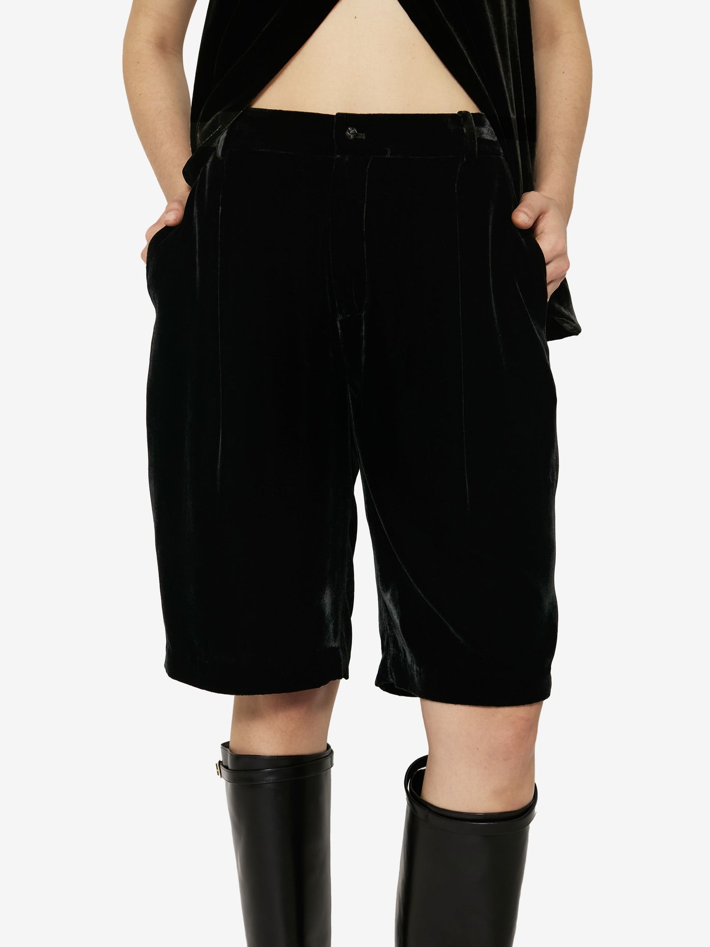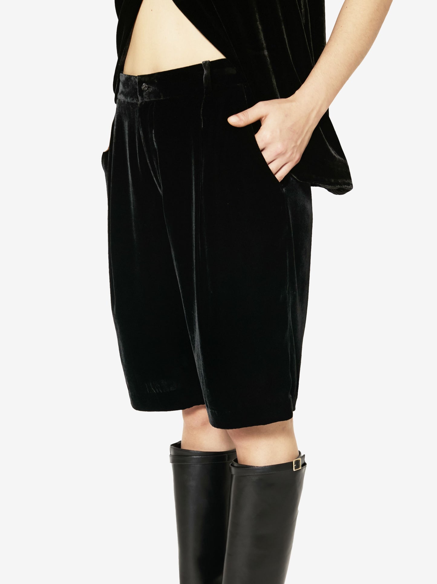 Sophisticated and timeless, these tailored bermuda shorts balance structure and ease with refined pleats, while a handcrafted satin knot button at the waistband adds a subtle statement detail.