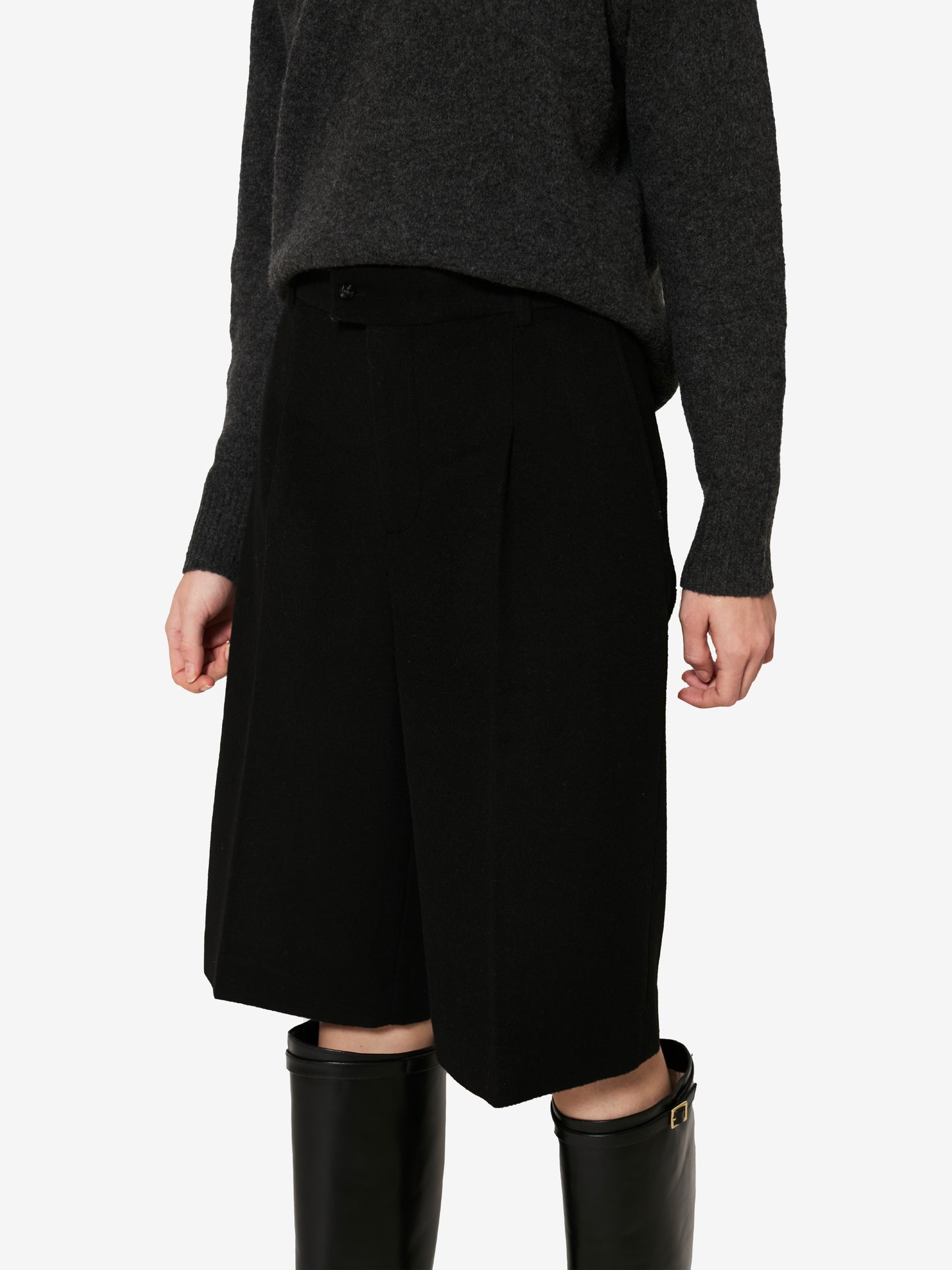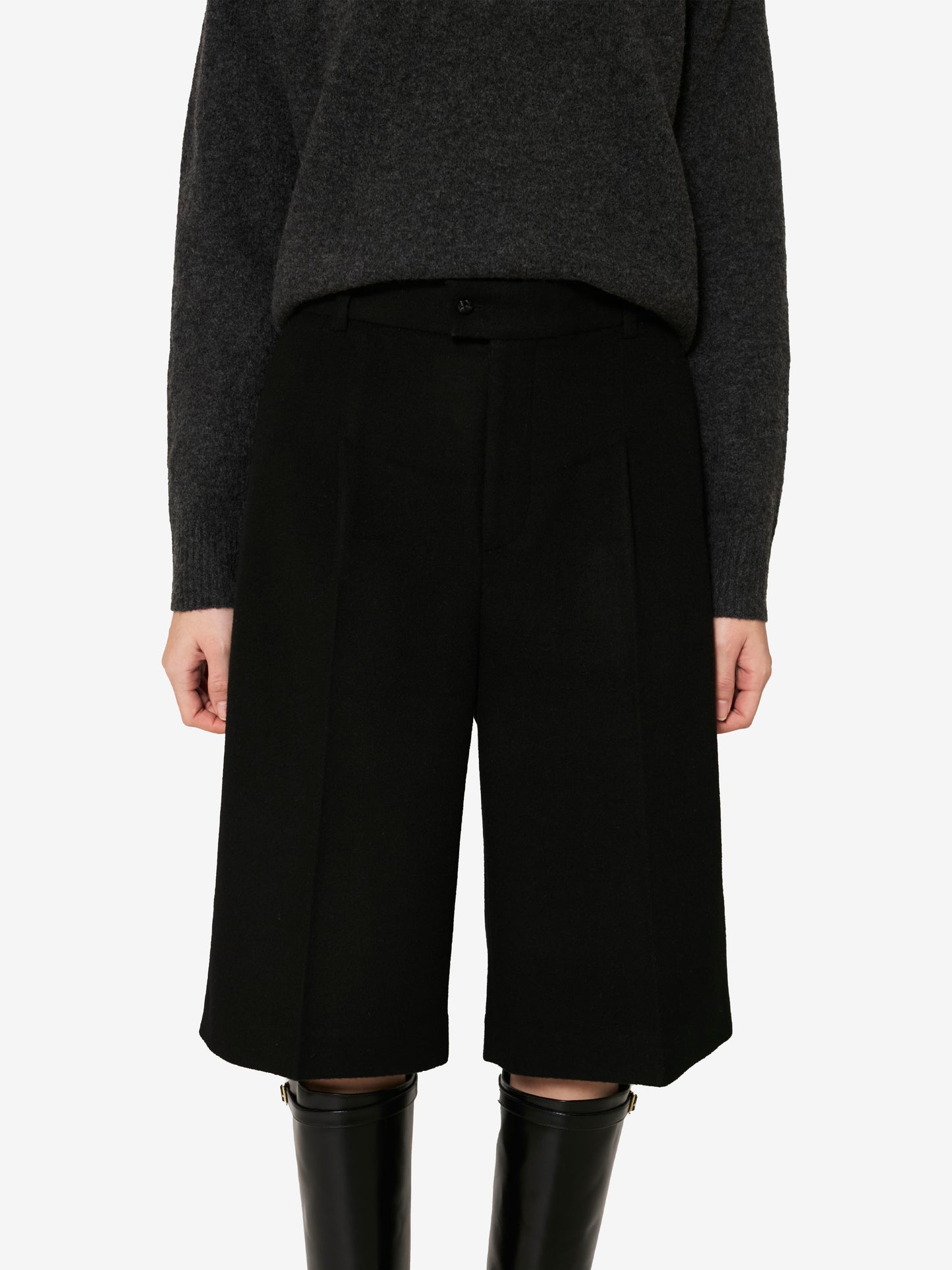 Sophisticated and timeless, these tailored bermuda shorts balance structure and ease with refined pleats, while a handcrafted satin knot button at the waistband adds a subtle statement detail.