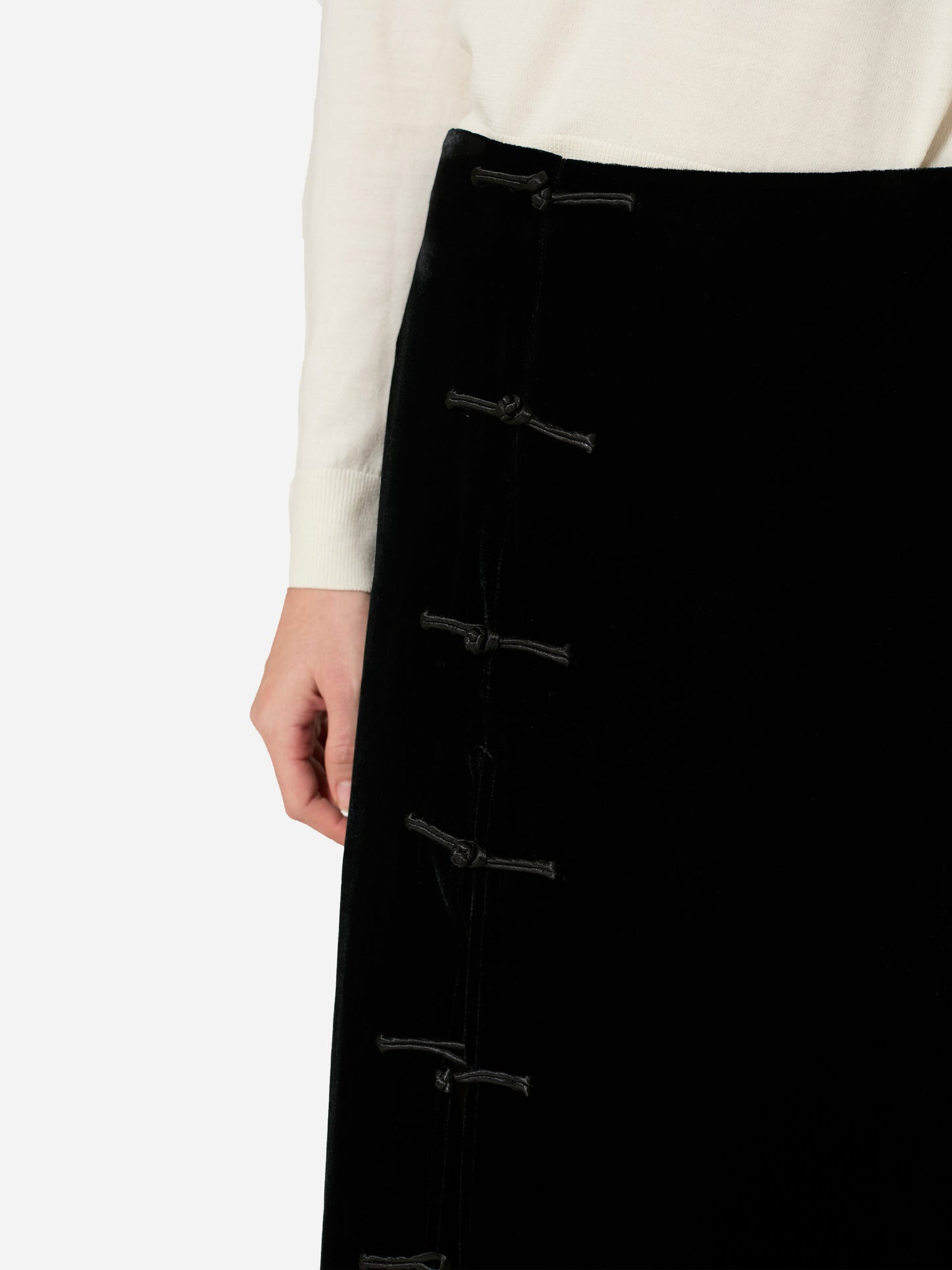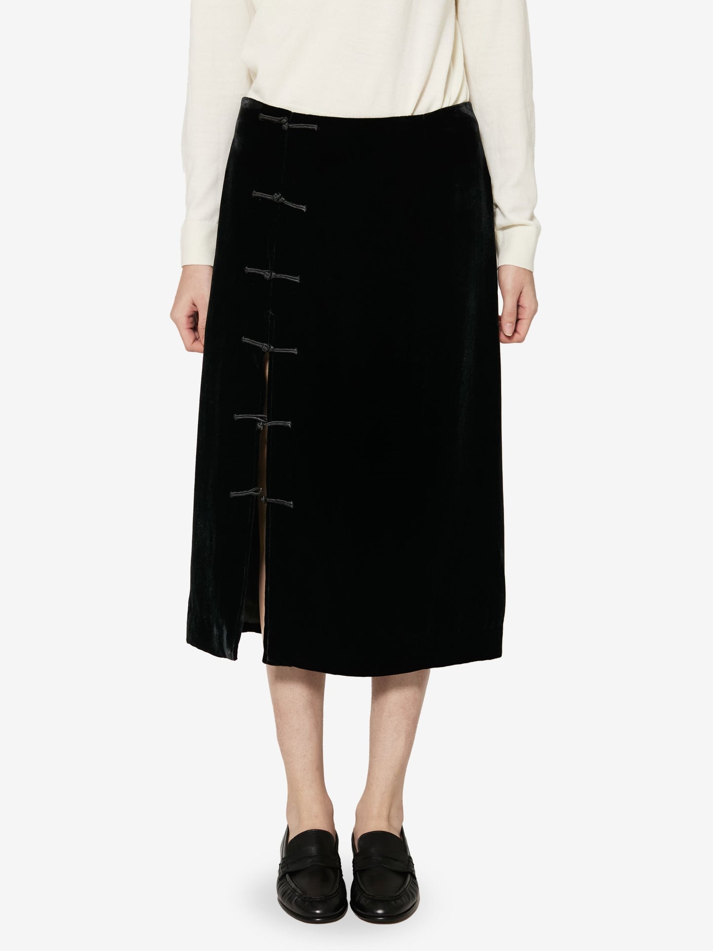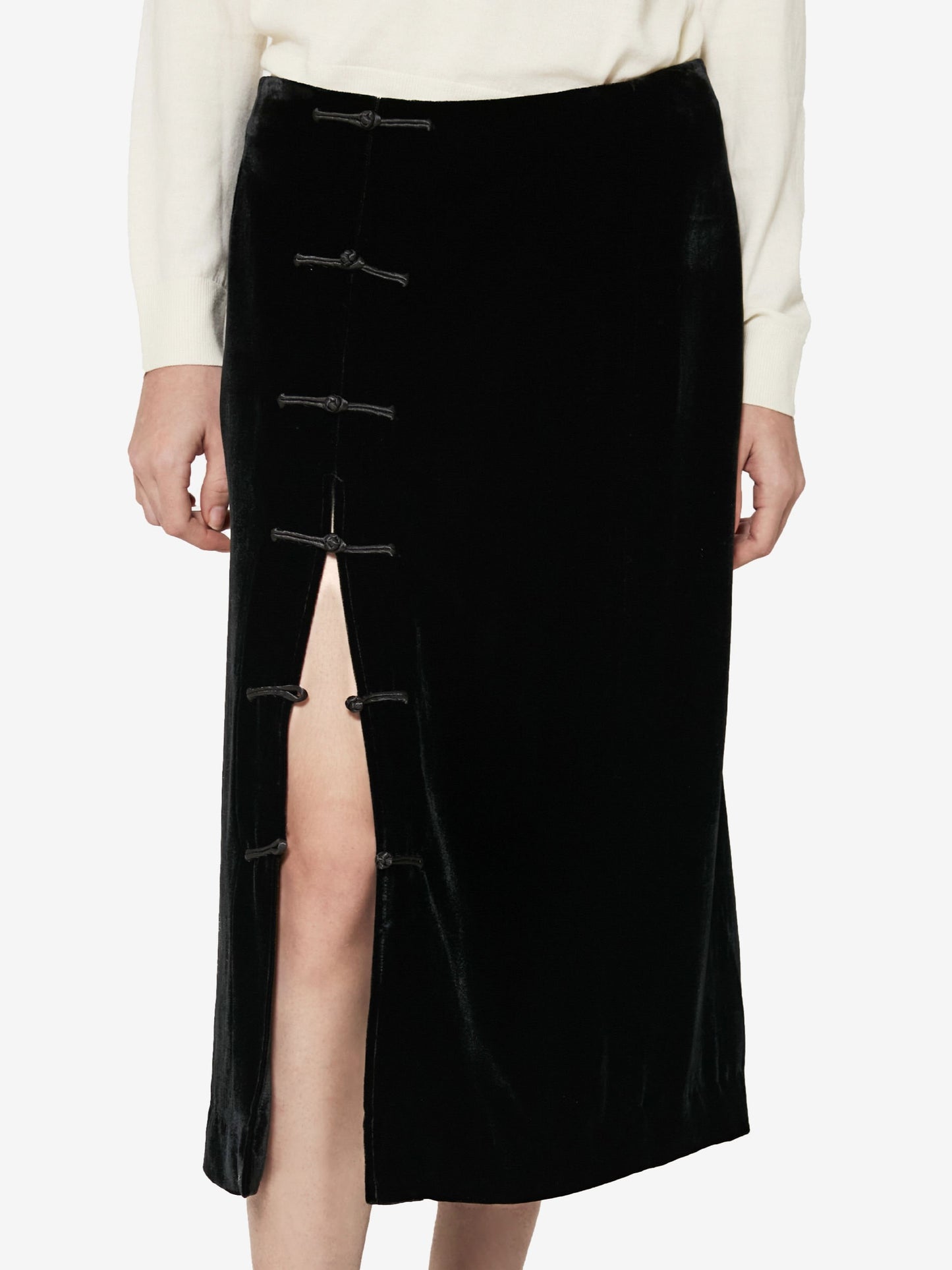 Sophisticated and timeless, this midi skirt, newly introduced into the core collection, blends the codes of past eras with a modern, refined allure. The front slit, adorned with a handcrafted frog button closure, offers a subtle yet empowering edge, inviting movement and self-expression.