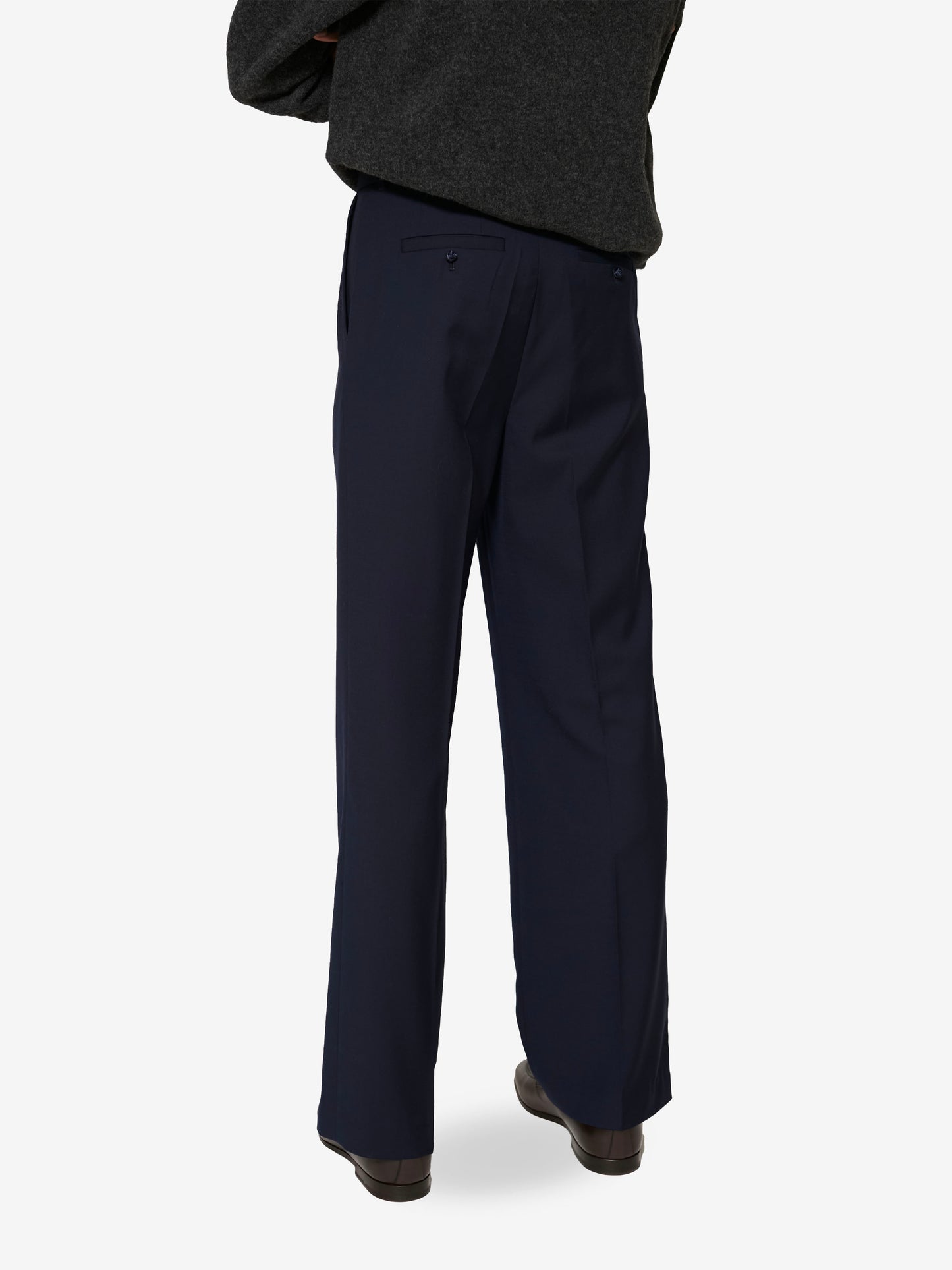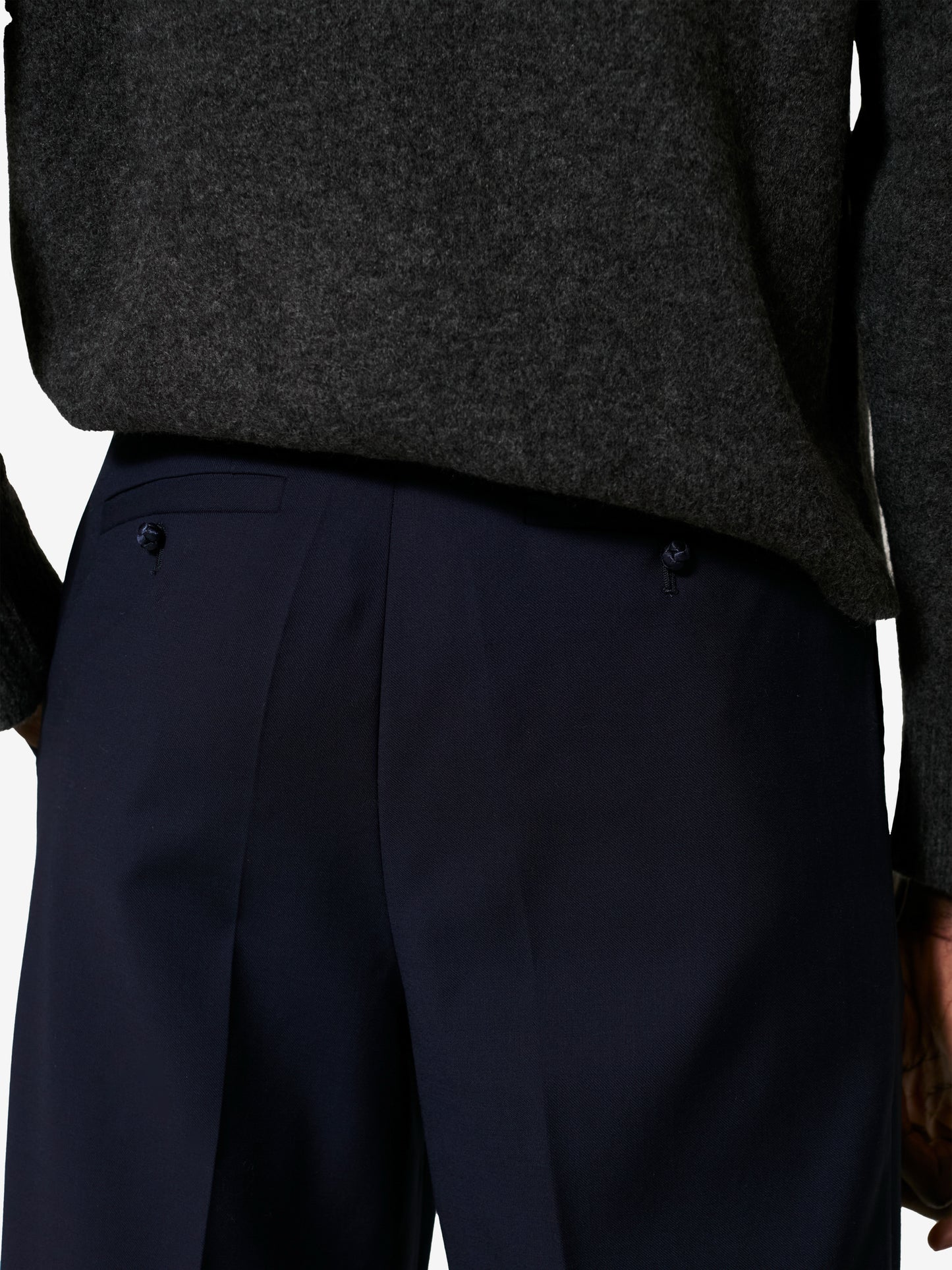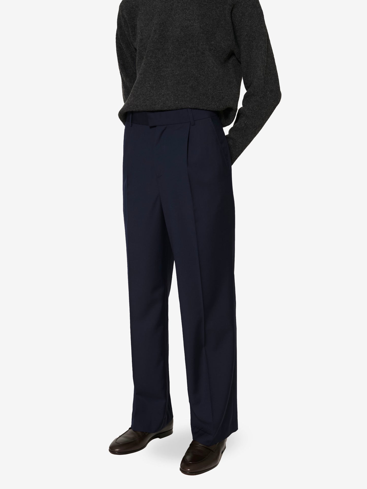 Sophisticated and timeless, these pants feature a straight-leg cut and a mid-rise waist, with refined pleats that shape and elevate their tailored silhouette. Side slit pockets that elevate their tailored silhouette and back welt pockets combine function and refinement, while a handcrafted satin knot button at the waistband adds a quite yet distinctive detail.