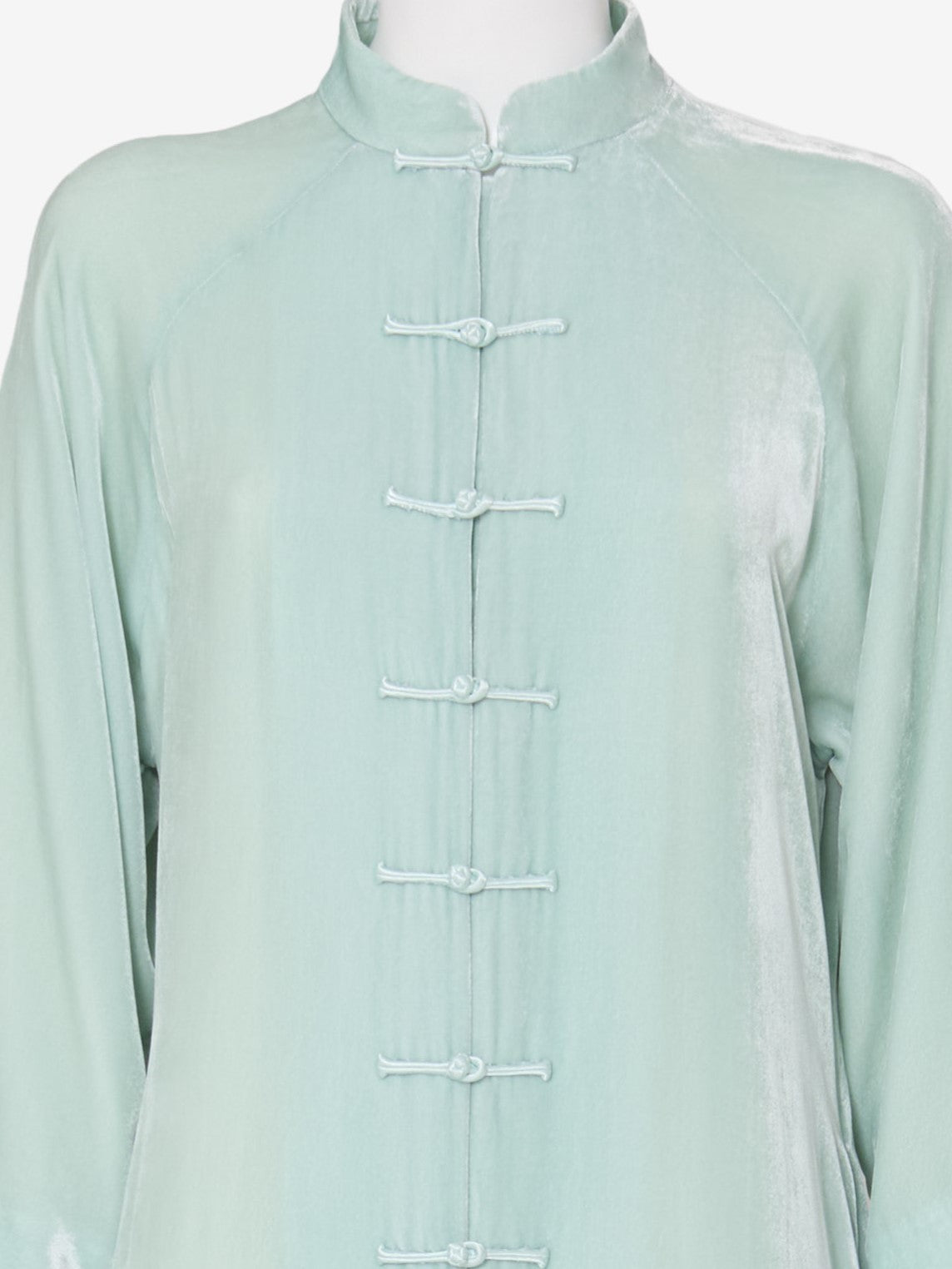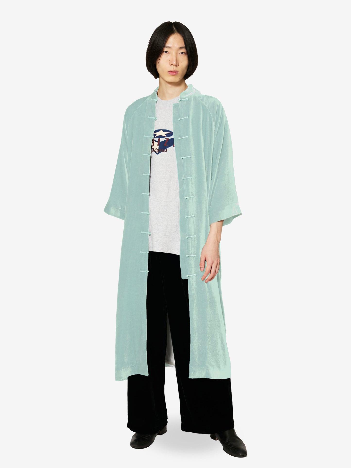 Sophisticated and timeless, this light coat is crafted from richly textured velvet. Featuring a handcrafted satin frog button closure, it evokes the refinement of past eras while remaining effortlessly modern. Flared sleeves and a raglan cut enhance its relaxed, flowing silhouette.