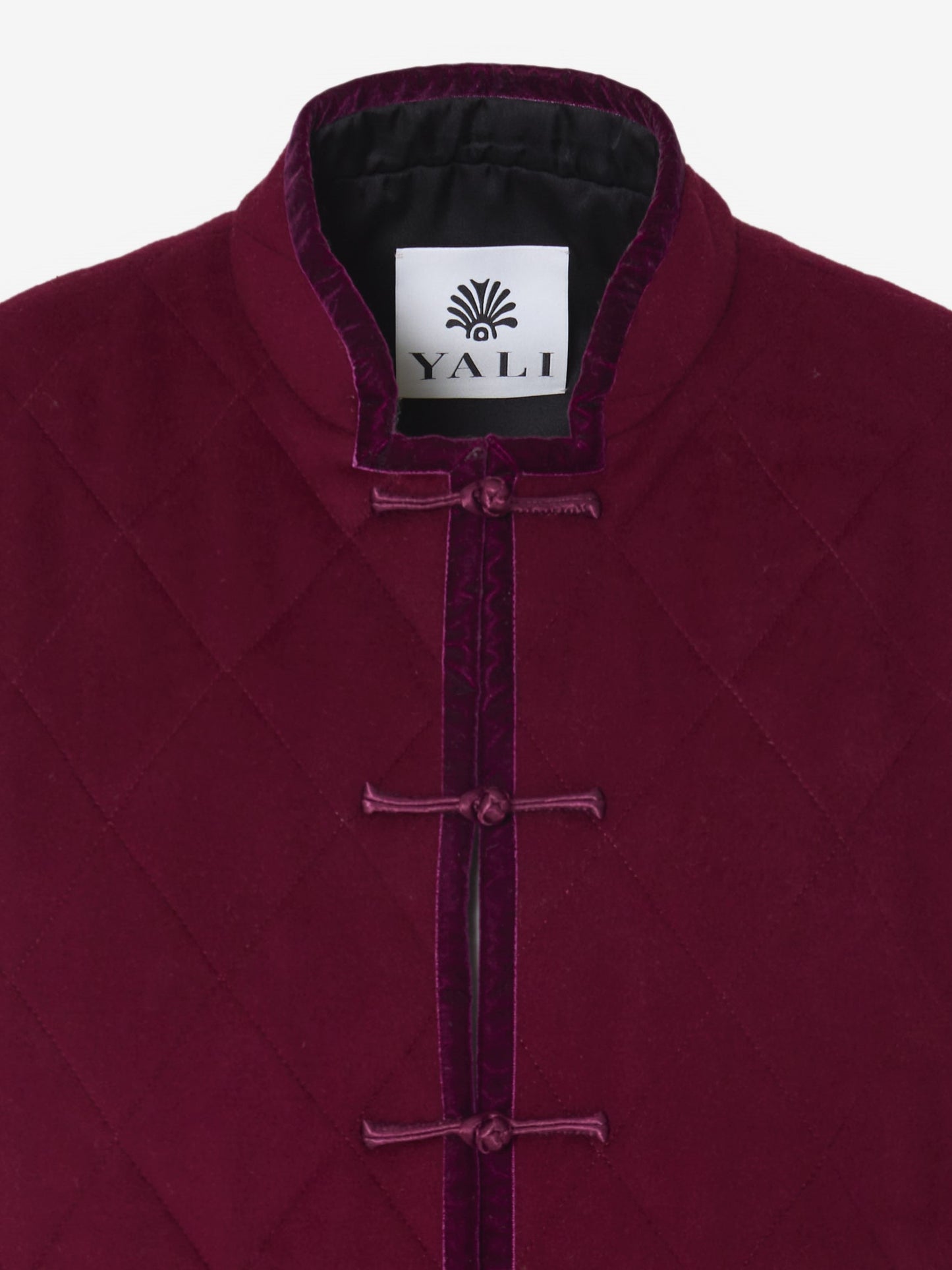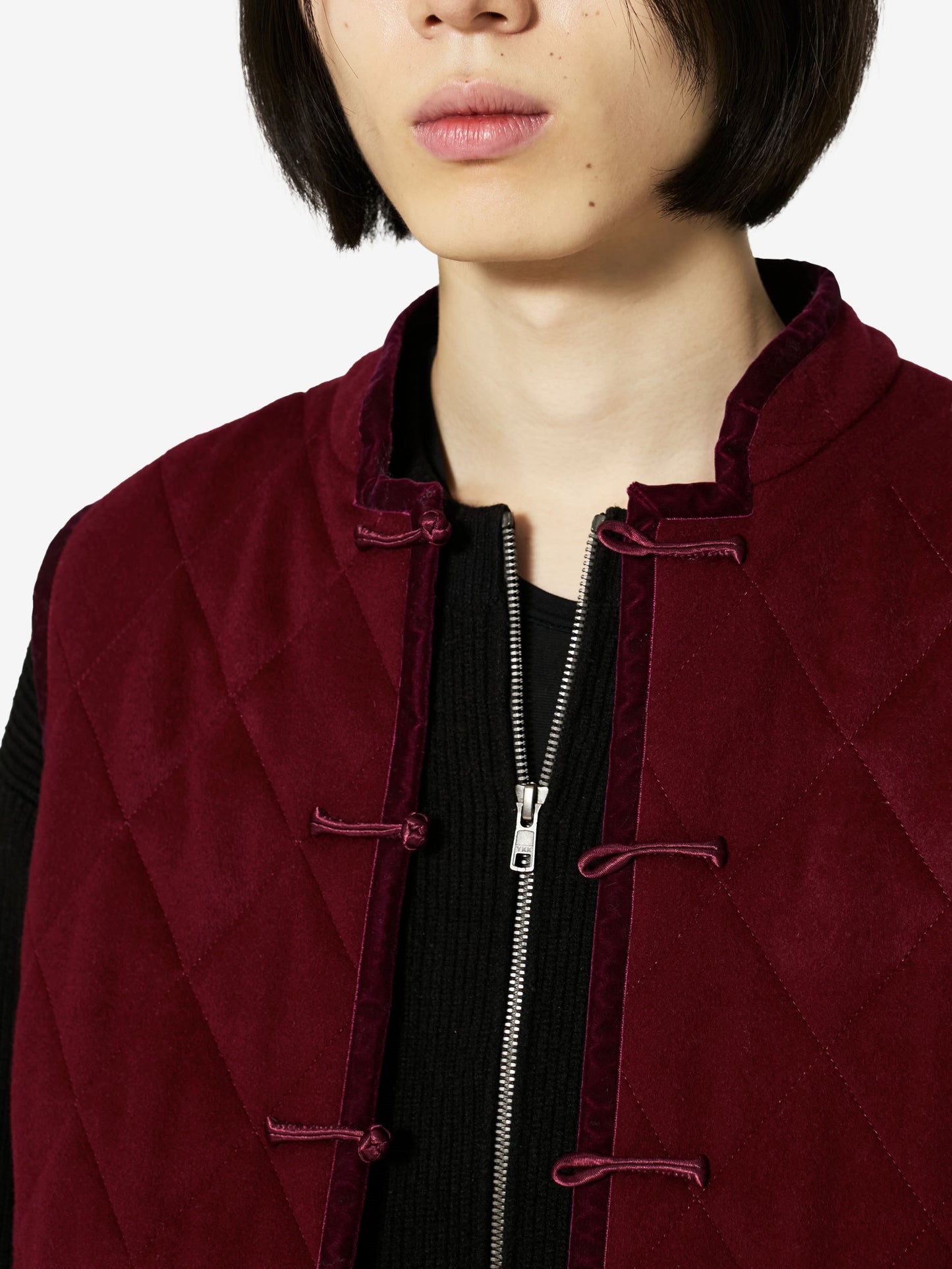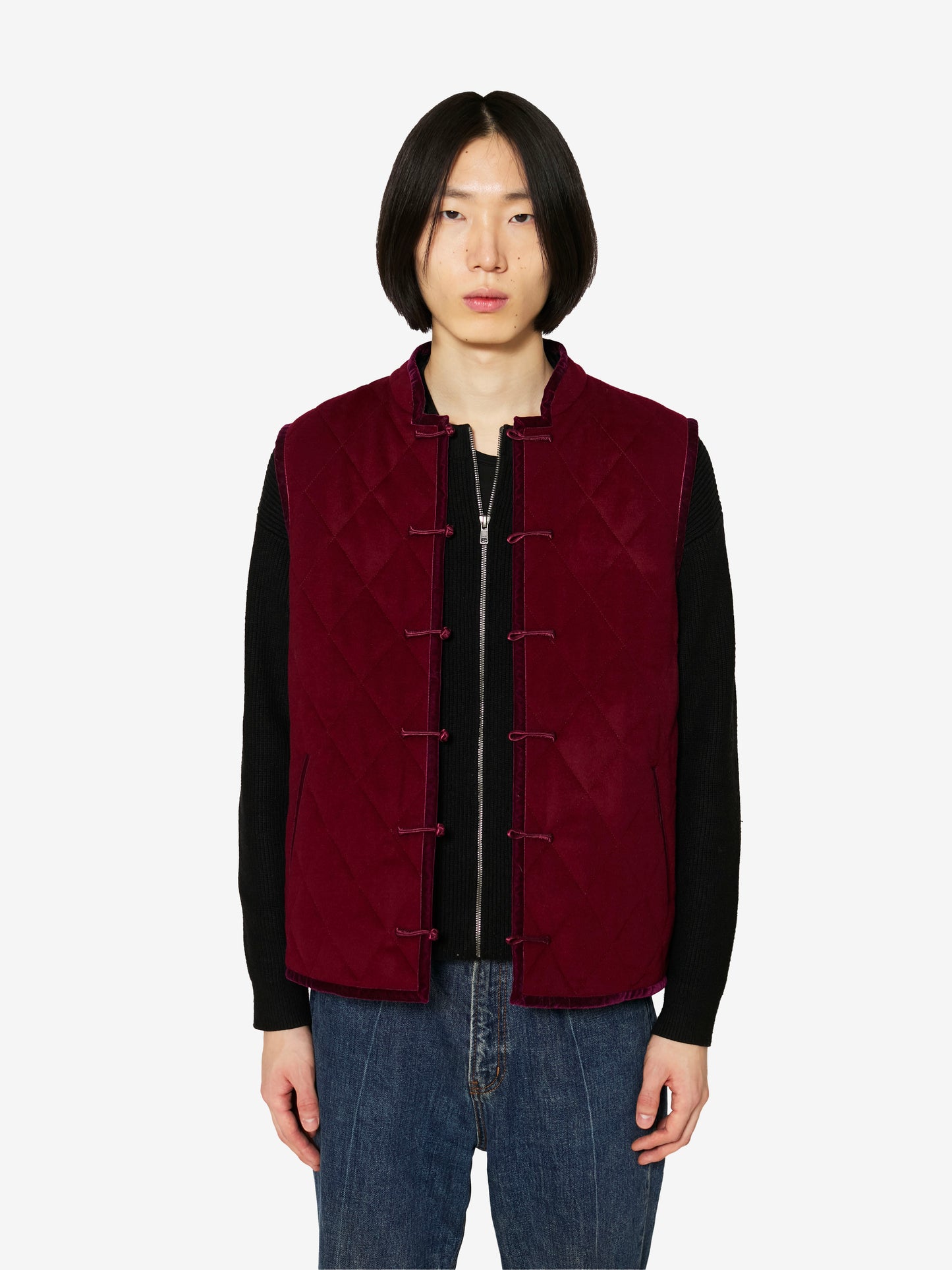 Relaxed and refined, this signature quilted vest features a handcrafted satin frog button closure and a rounded stand collar that frames the neckline with subtle structure. Its loose cut adds an effortless tone, making it both comfortable and versatile.