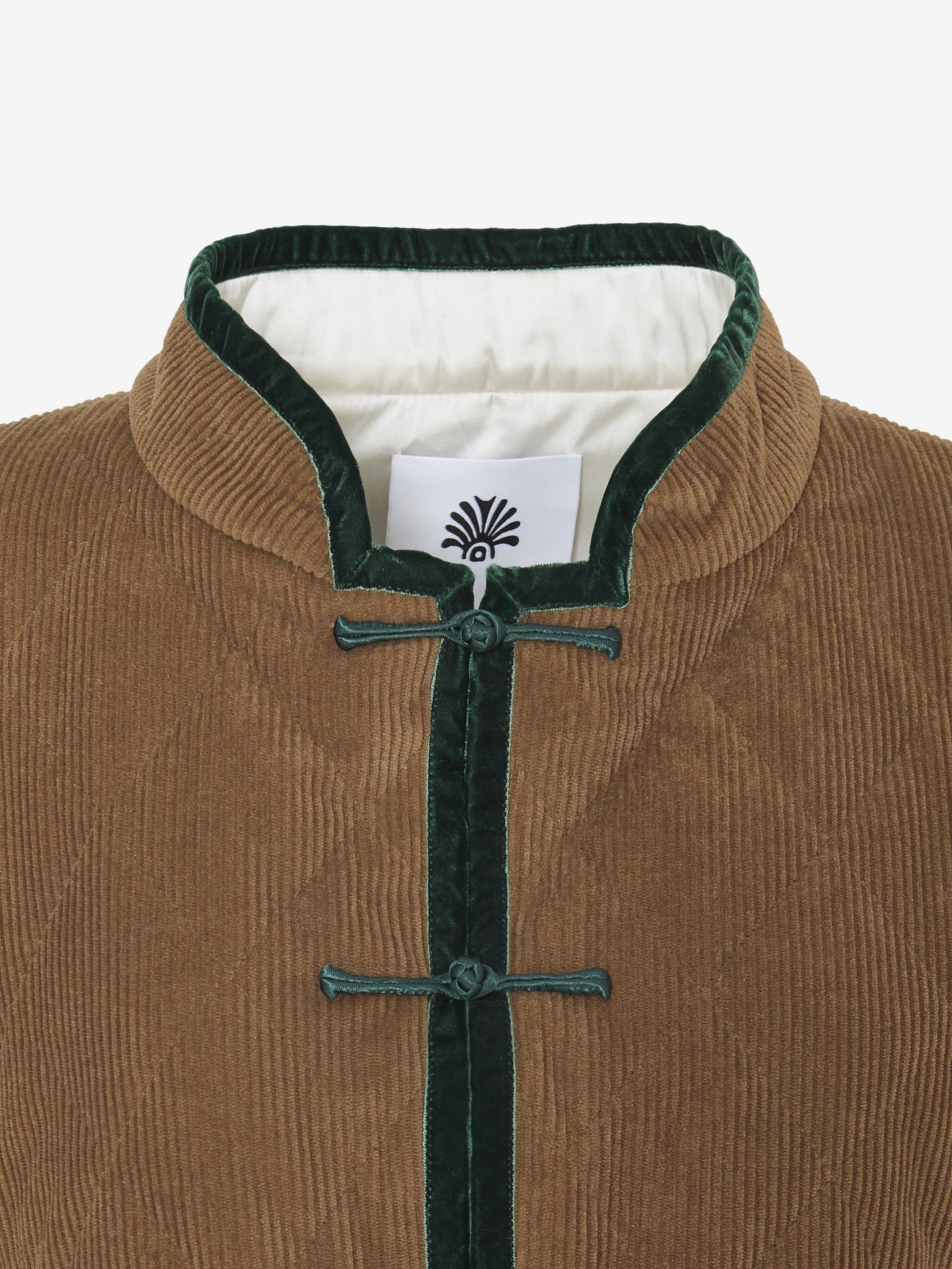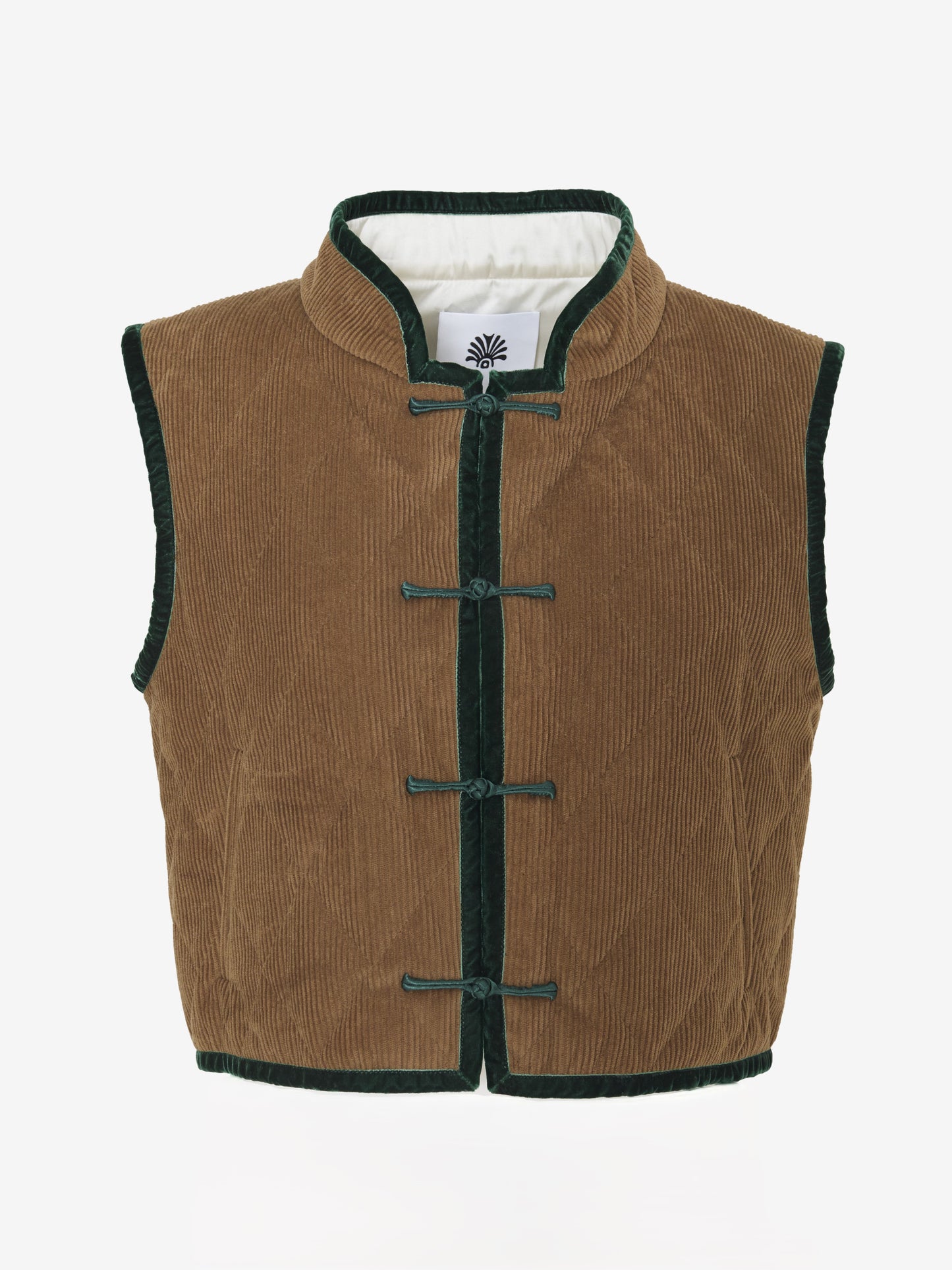 Relaxed and refined, this signature quilted vest features a handcrafted satin frog button closure and a rounded stand collar that frames the neckline with subtle structure. A cold-season essential, it can be worn over knits or layered under a coat for extra warmth.