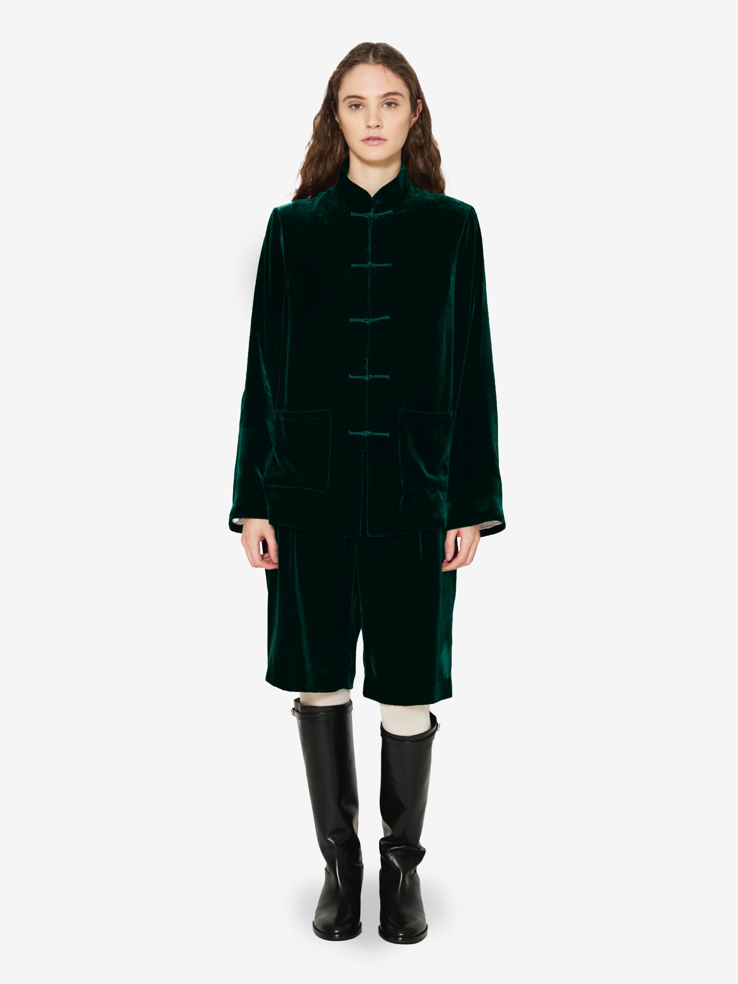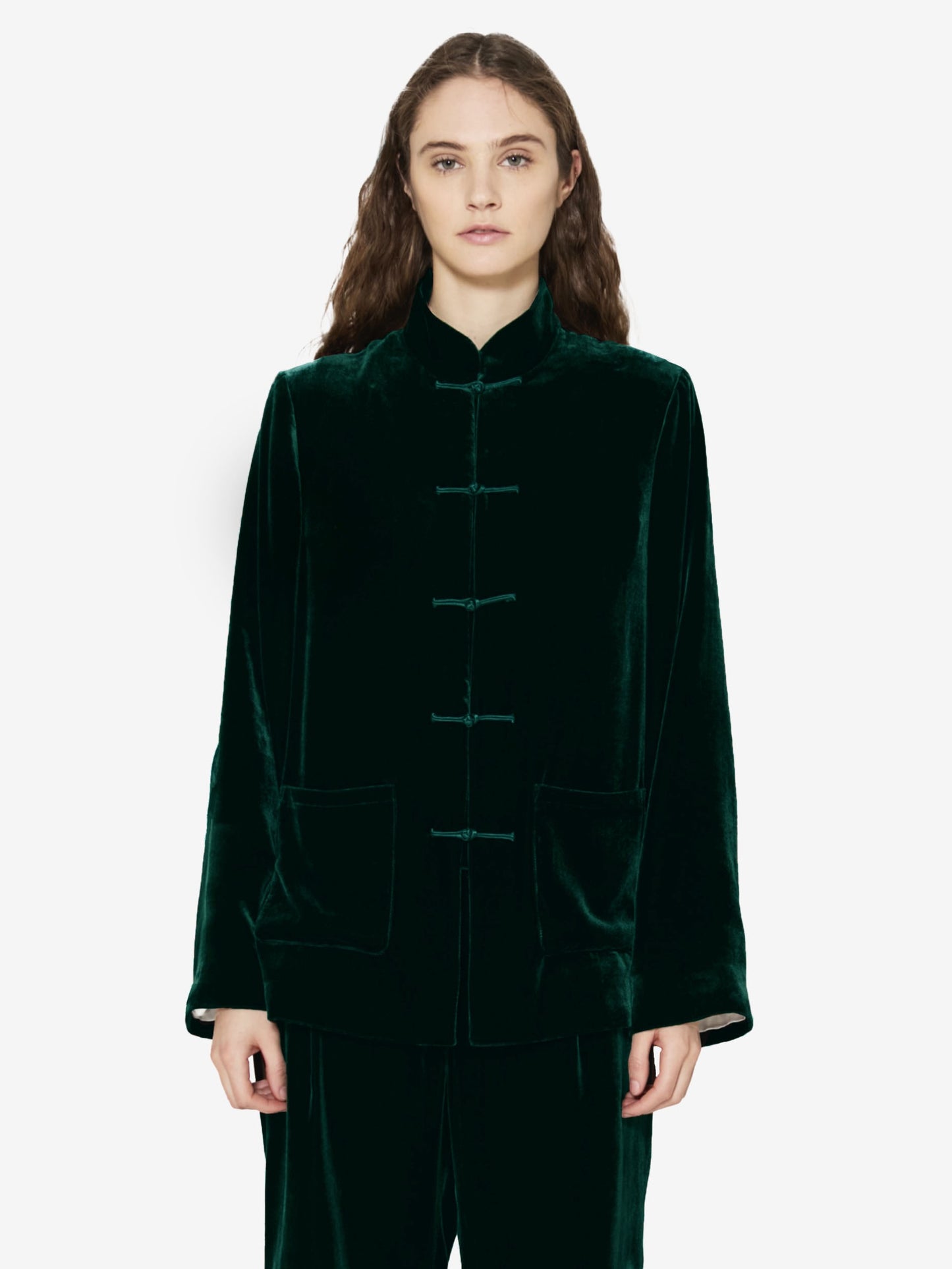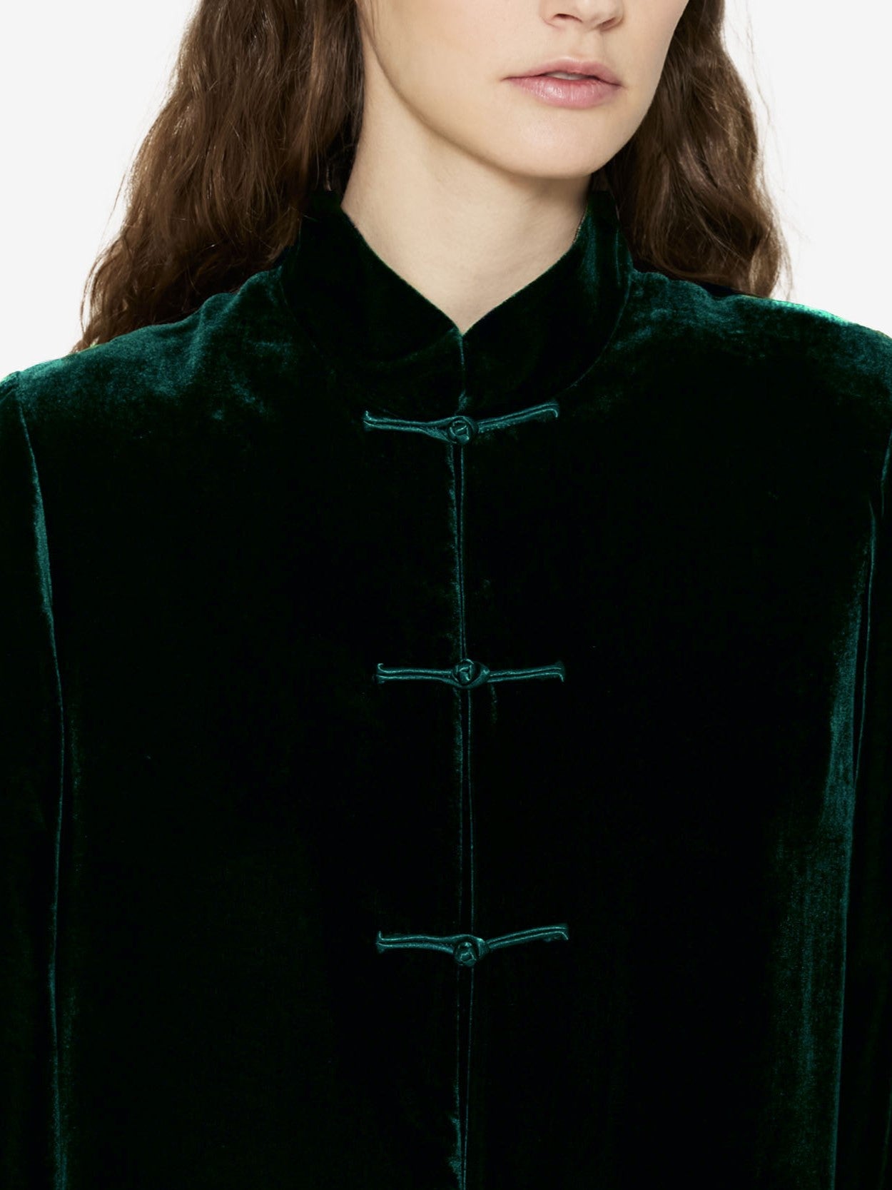 Sophisticated and timeless, this signature blazer is crafted from richly textured velvet. Featuring a handcrafted satin frog button closure, it evokes the refinement of past eras while remaining effortlessly modern.