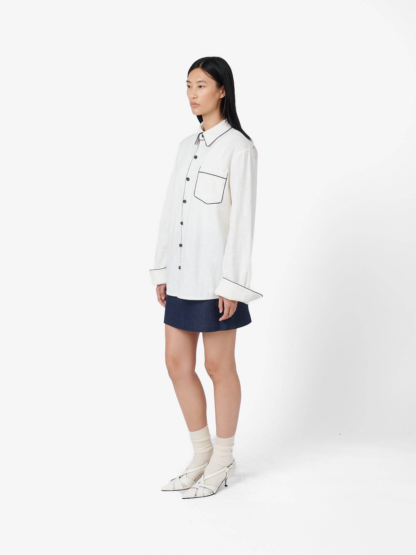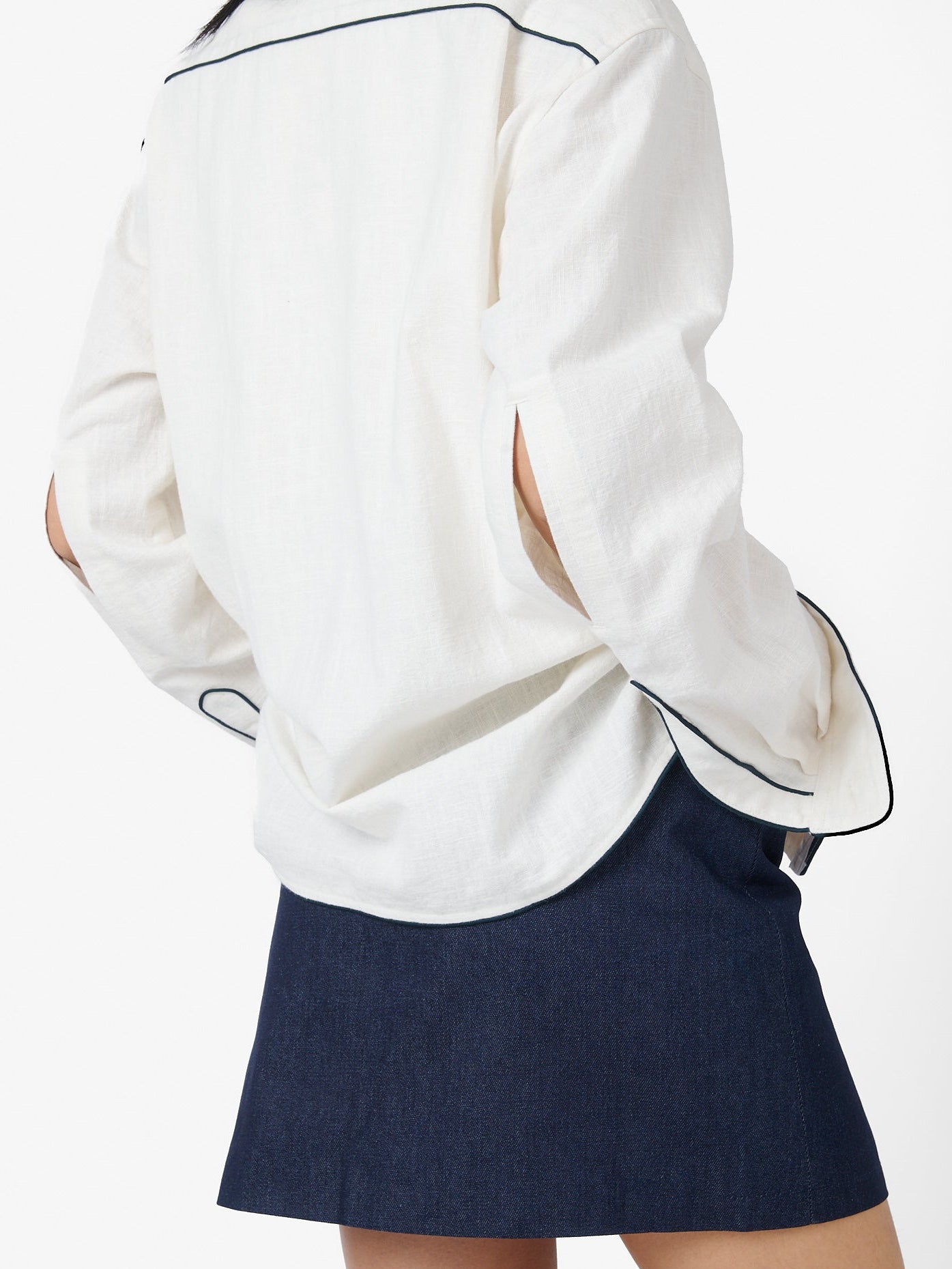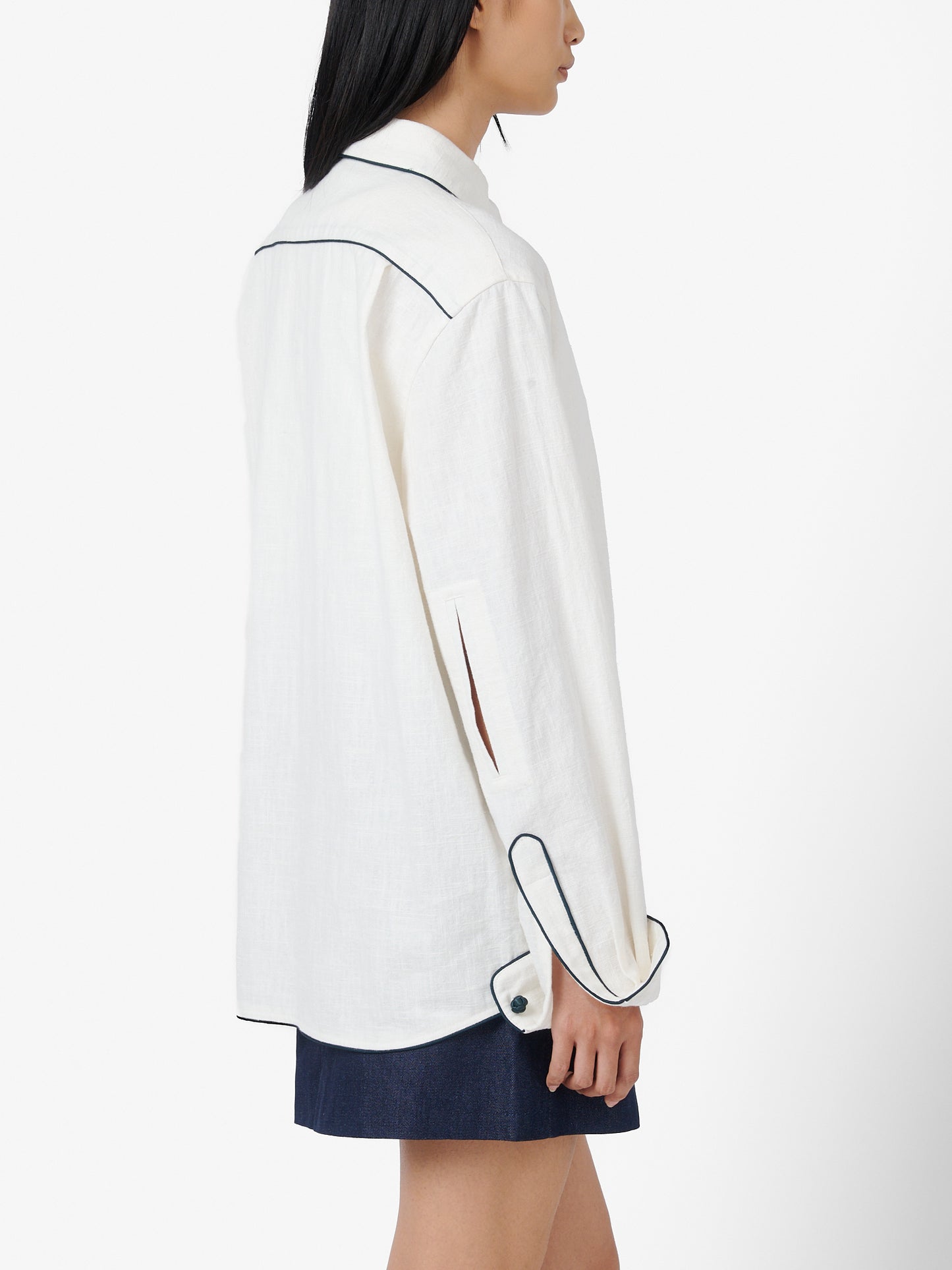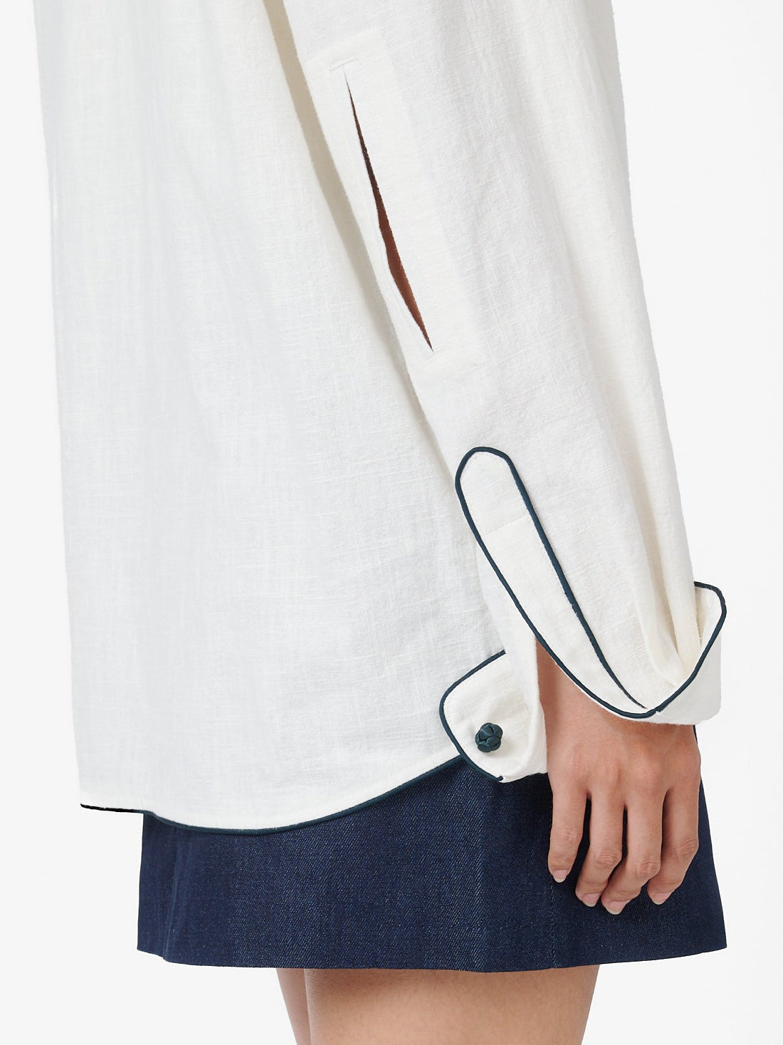Effortlessly relaxed yet refined, this white linen shirt is cut in a regular, slightly oversized silhouette, offering ease and understated elegance. Contrasting petrol green piping and handcrafted knot buttons define the front fastening and cuffs, adding subtle sophistication.