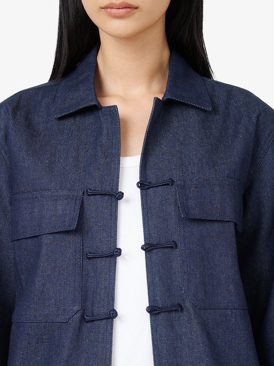 Defined by handcrafted frog button closures and the understated simplicity of raw denim, this blazer is ideal for daytime wear. It conveys a true sense of care and intention while remaining inherently sophisticated.