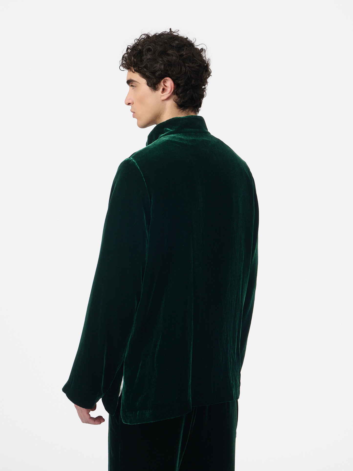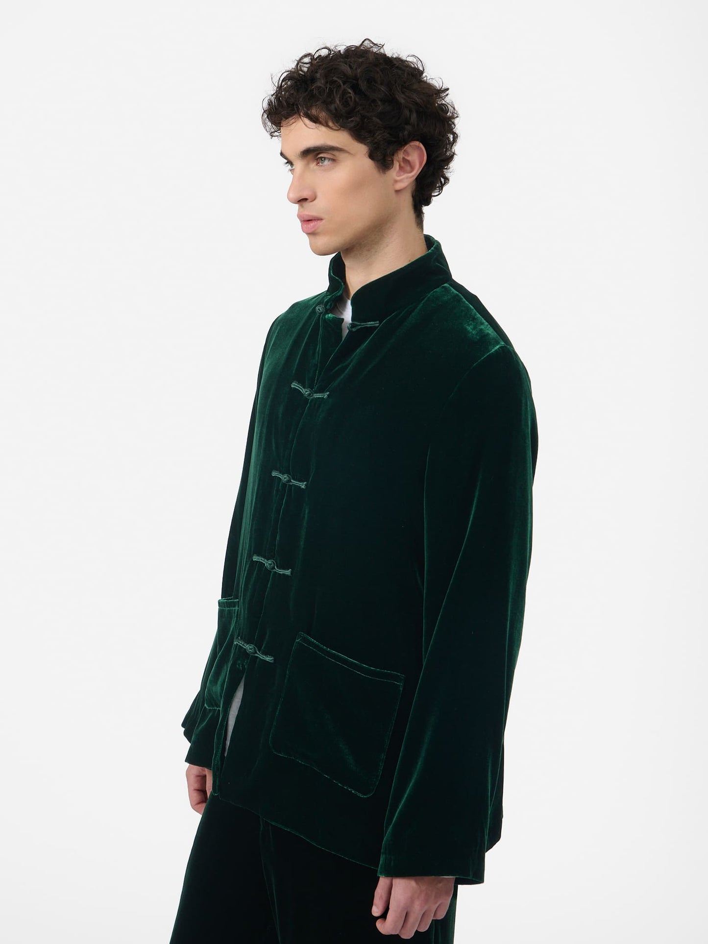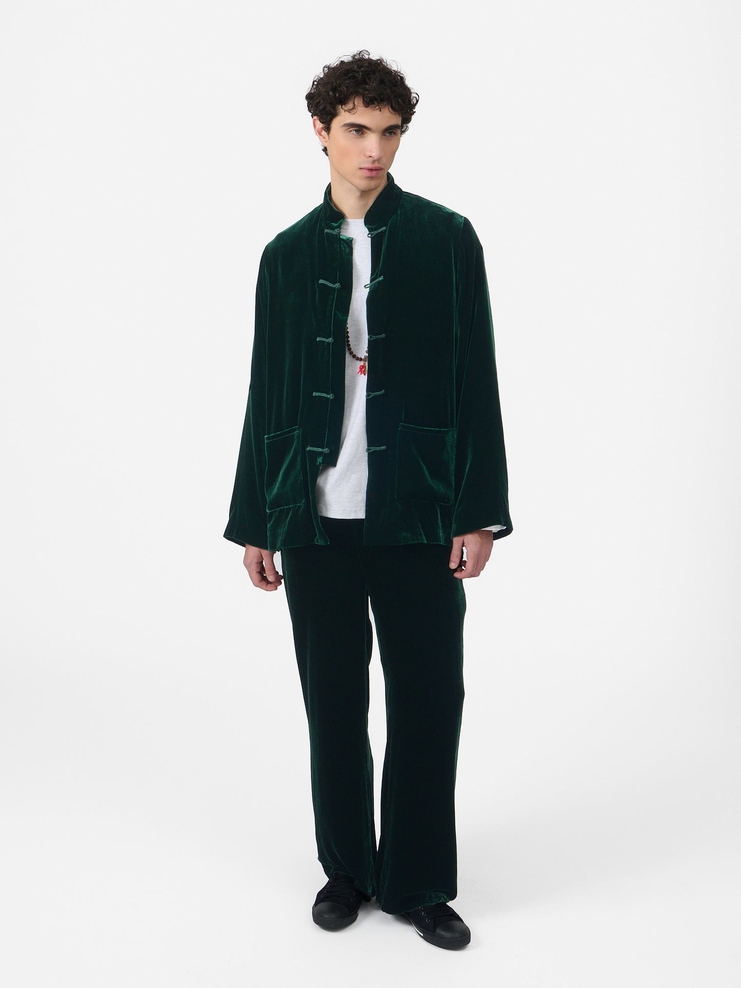 Sophisticated and timeless, this signature blazer is crafted from richly textured velvet. Featuring a handcrafted satin frog button closure, it evokes the refinement of past eras while remaining effortlessly modern.