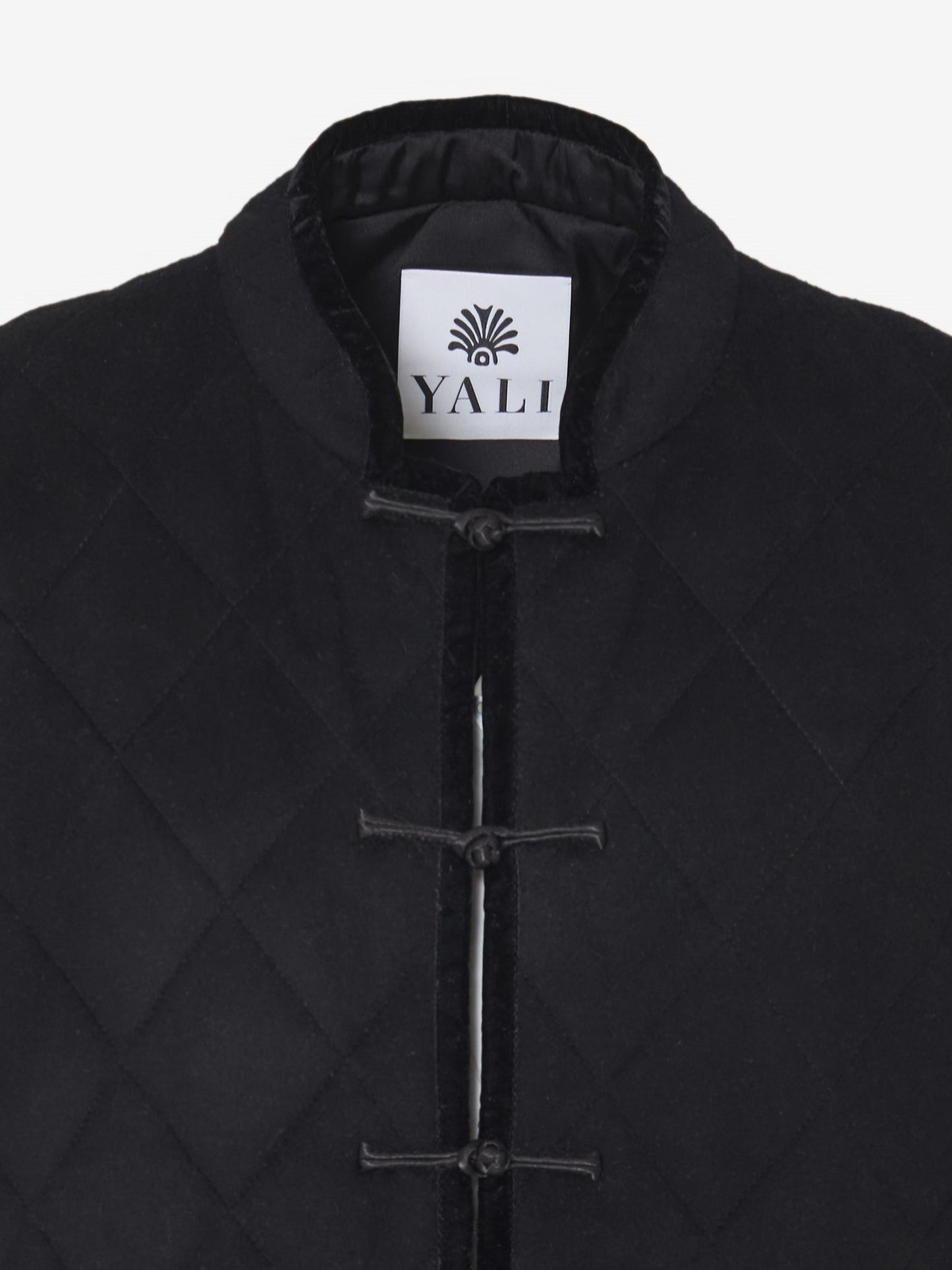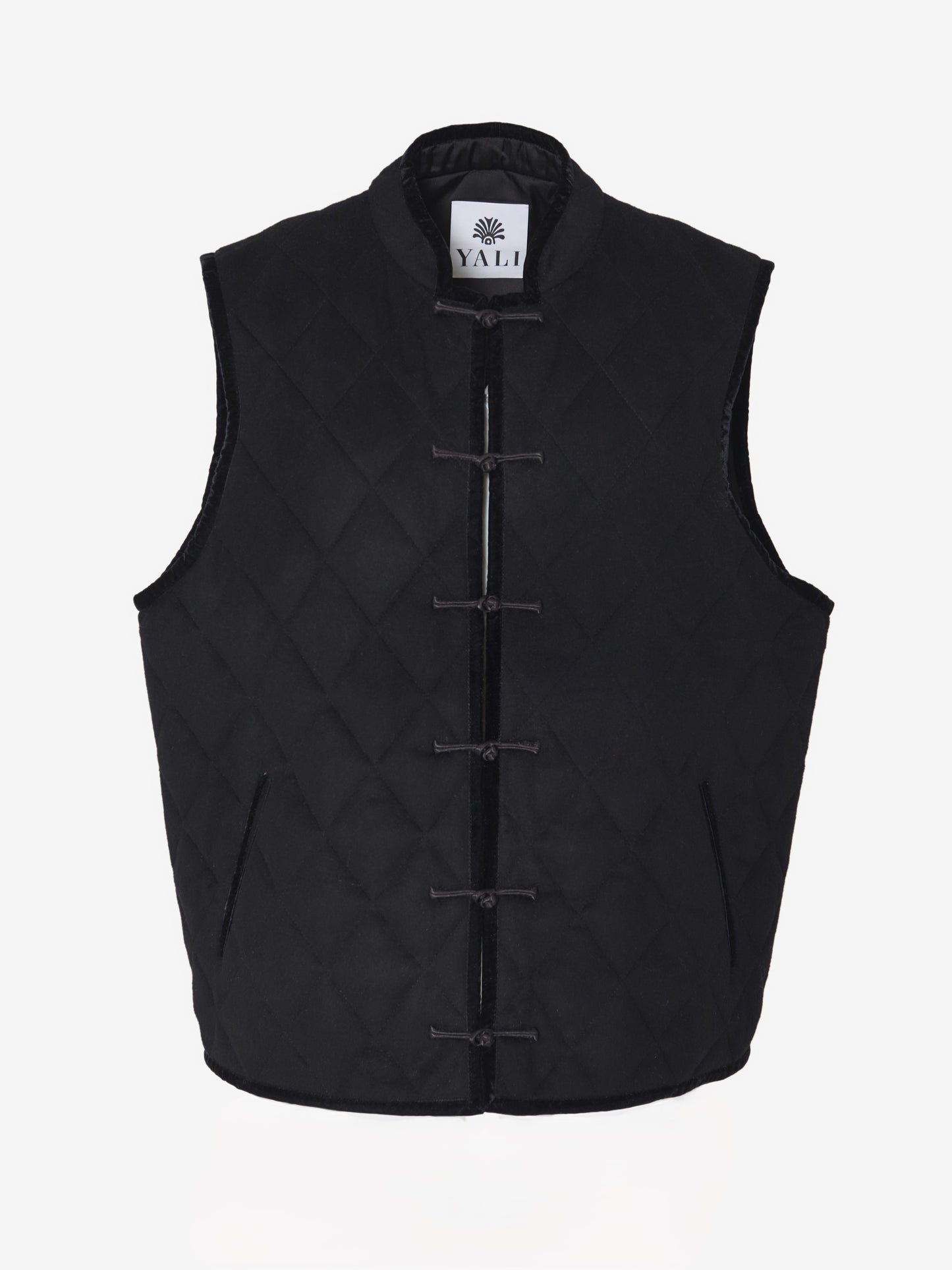 Relaxed and refined, this signature quilted vest features a handcrafted satin frog button closure and a rounded stand collar that frames the neckline with subtle structure. Its loose cut adds an effortless tone, making it both comfortable and versatile.