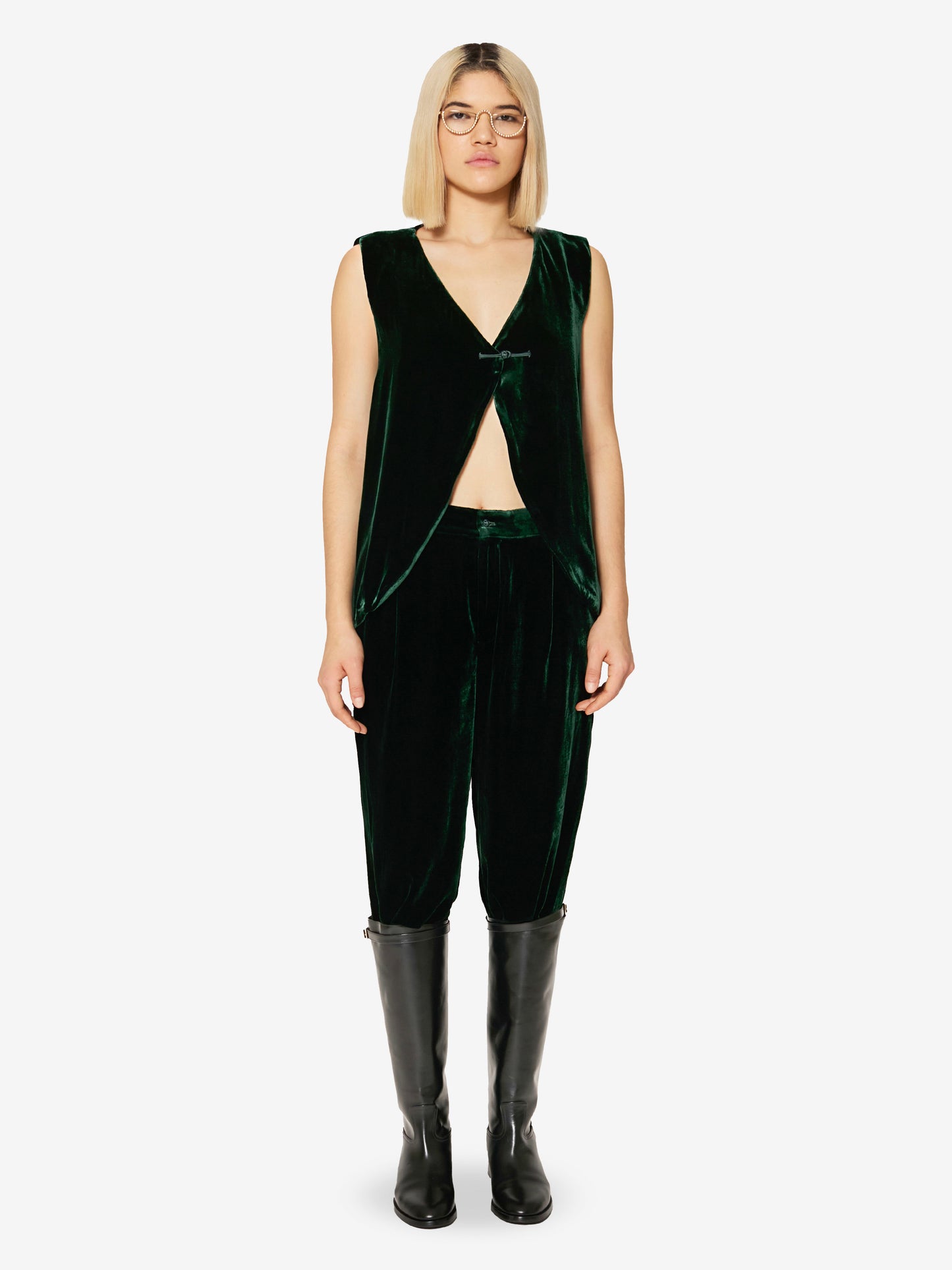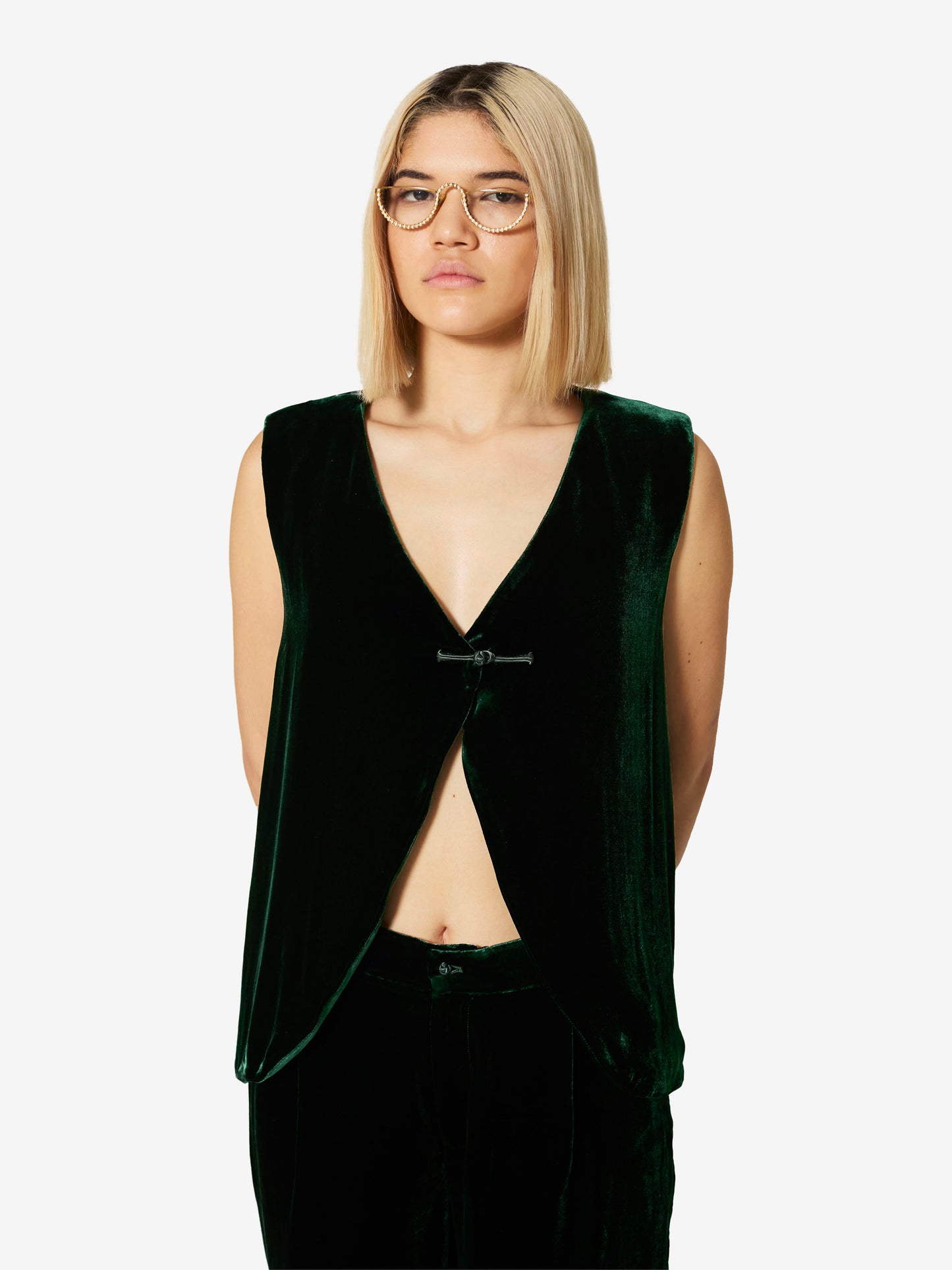 Sophisticated and timeless, this vest, newly introduced into the core collection, features a front handcrafted satin frog button closure. It merges design elements from past eras with modern culture.
