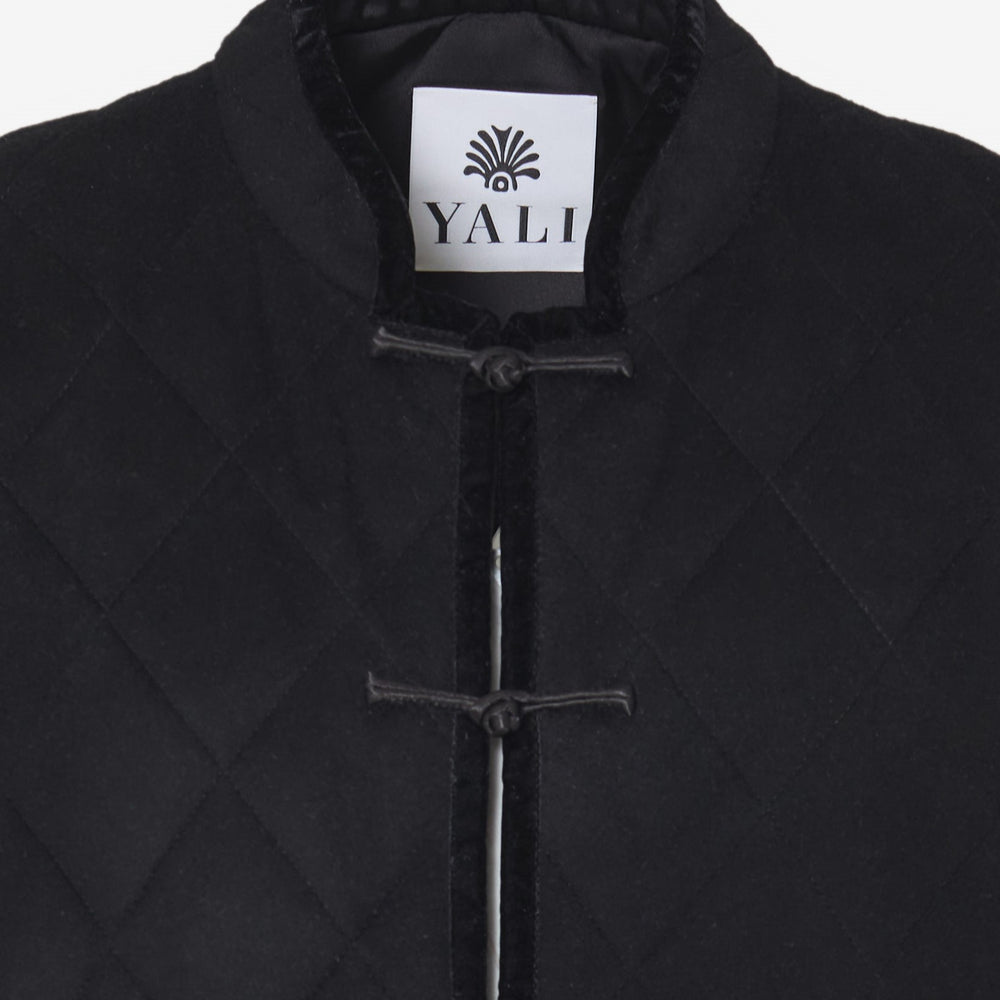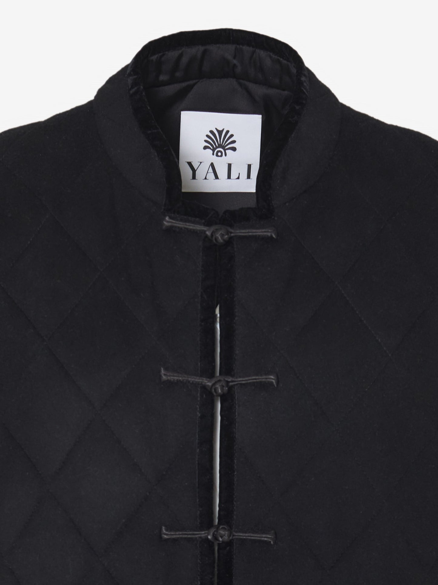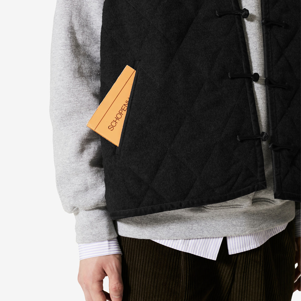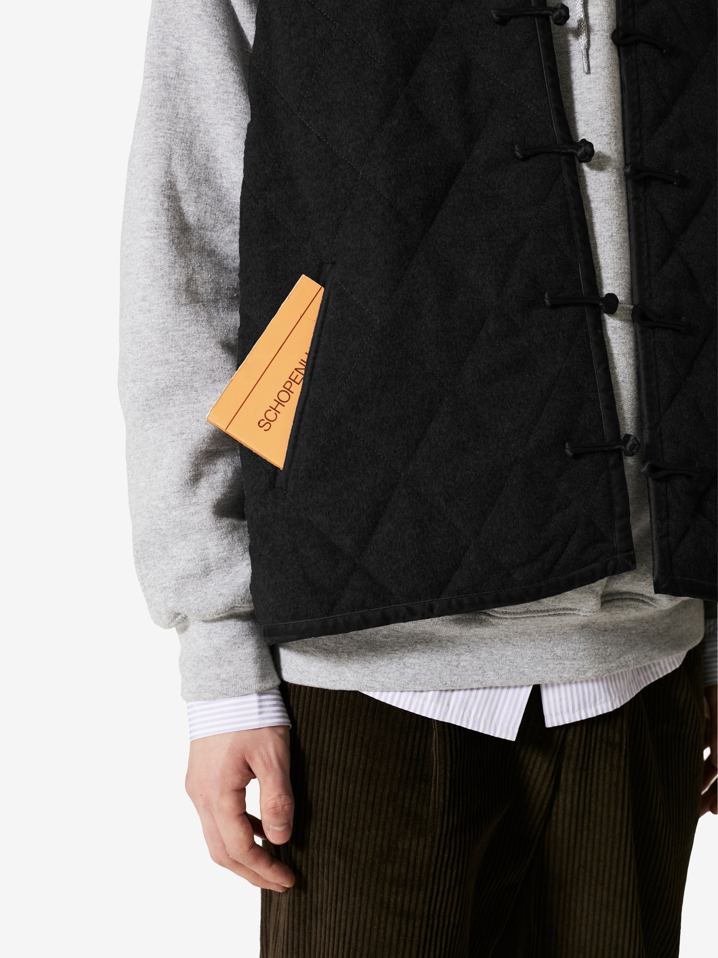 Relaxed and refined, this signature quilted vest features a handcrafted satin frog button closure and a rounded stand collar that frames the neckline with subtle structure. Its loose cut adds an effortless tone, making it both comfortable and versatile.