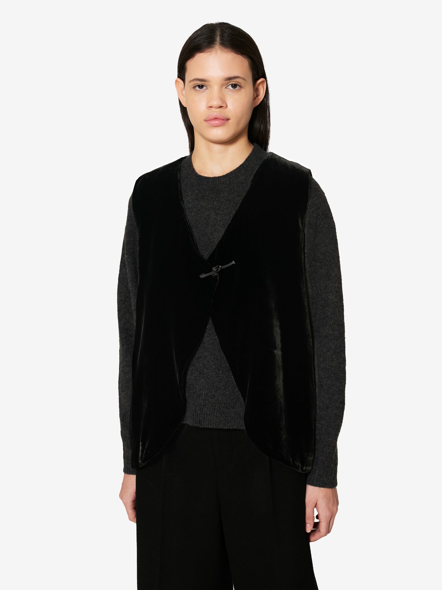 Sophisticated and timeless, this vest, newly introduced into the core collection, features a front handcrafted satin frog button closure. It merges design elements from past eras with modern culture.