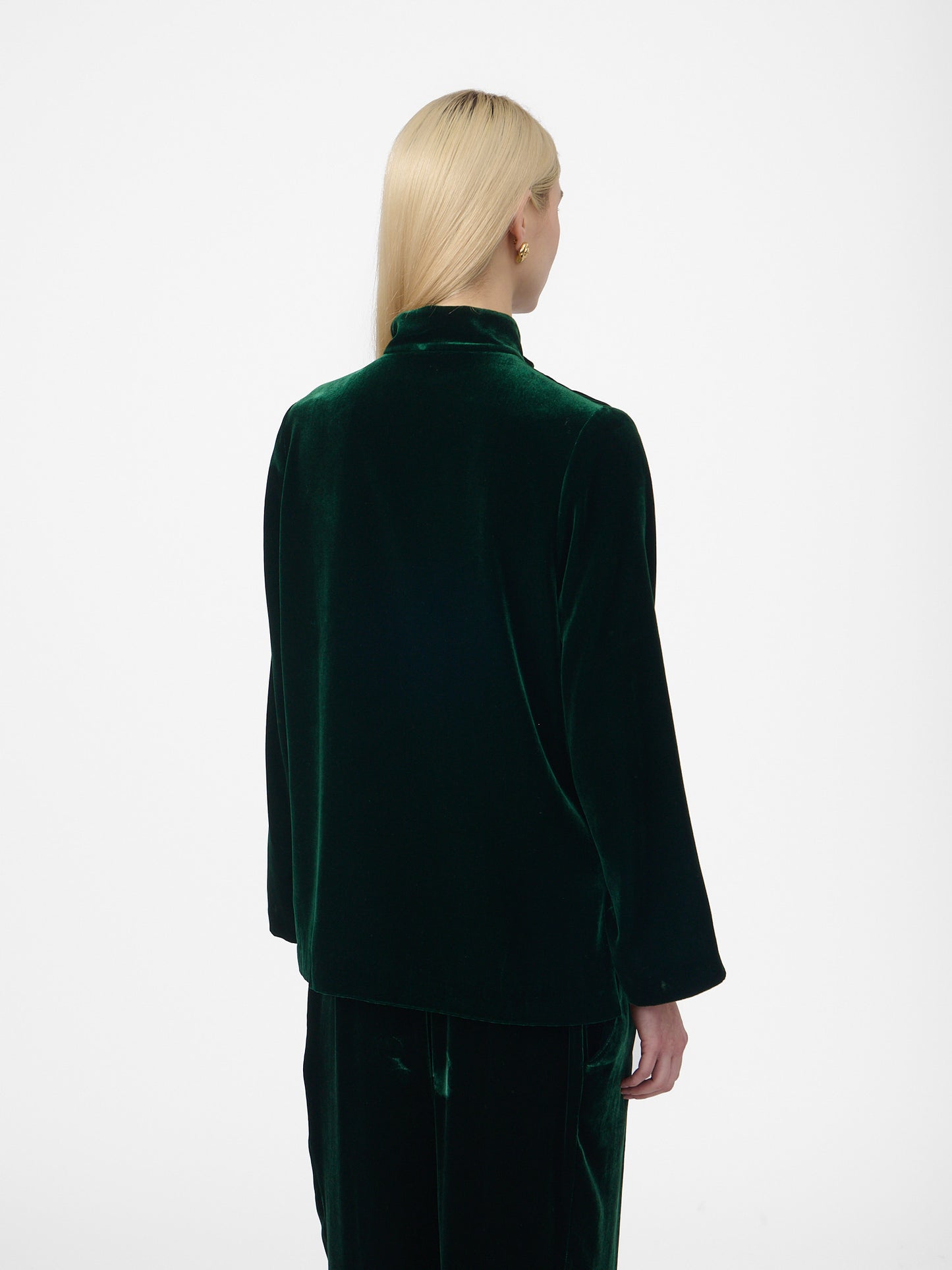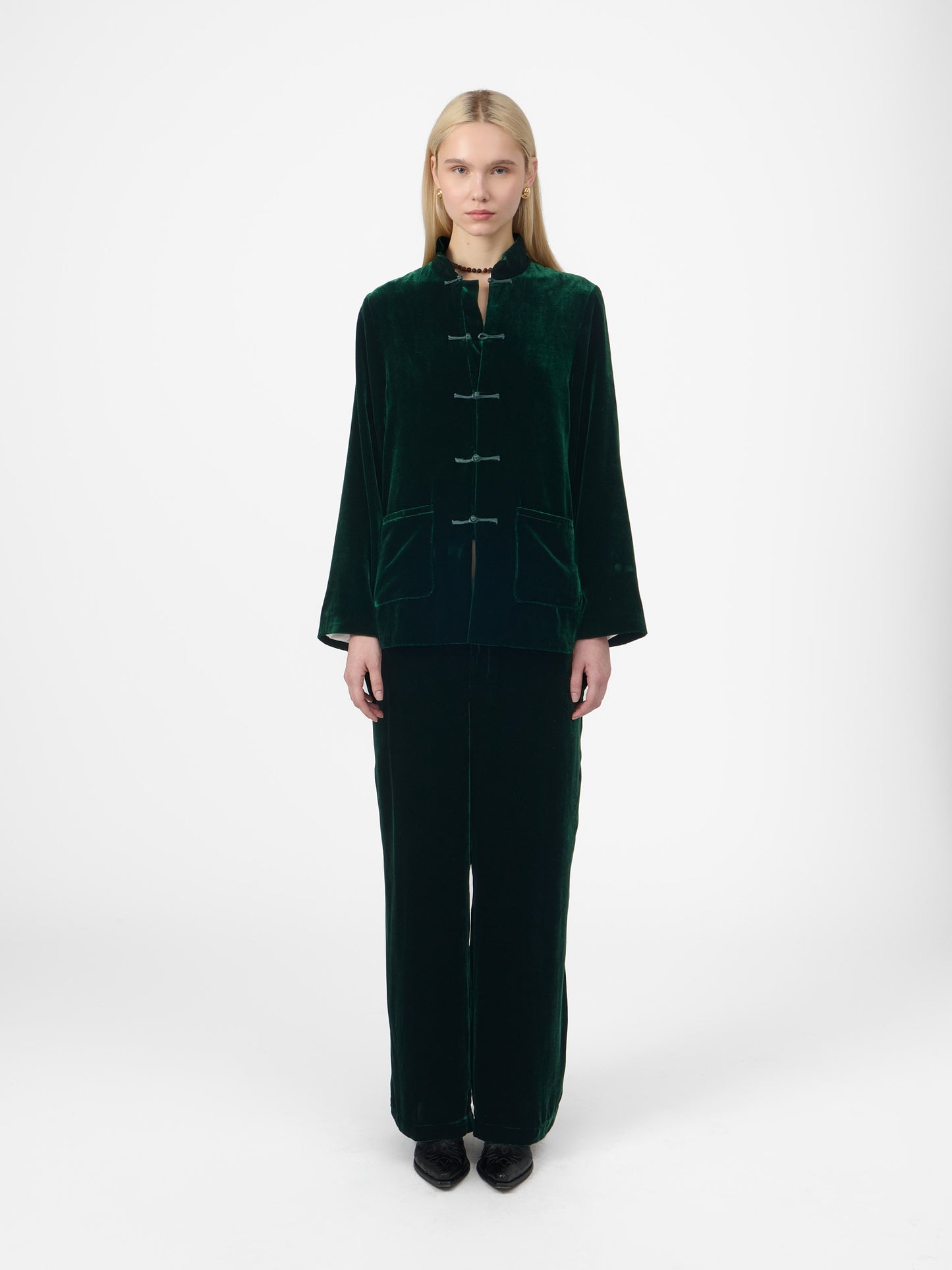 Sophisticated and timeless, this signature blazer is crafted from richly textured velvet. Featuring a handcrafted satin frog button closure, it evokes the refinement of past eras while remaining effortlessly modern.