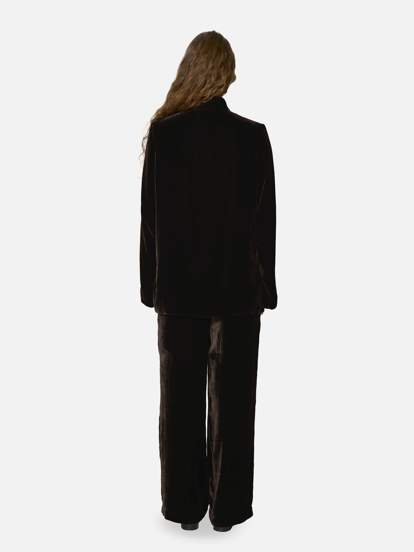 Crafted from richly textured velvet, the piece pairs effortlessly with both casual and elevated looks, whether styled with fluid shirting or knits. A true staple, designed for those who embrace enduring comfort, quiet strength, and intentional simplicity.