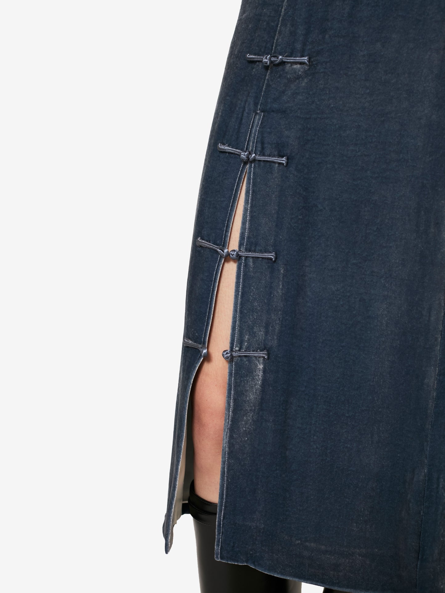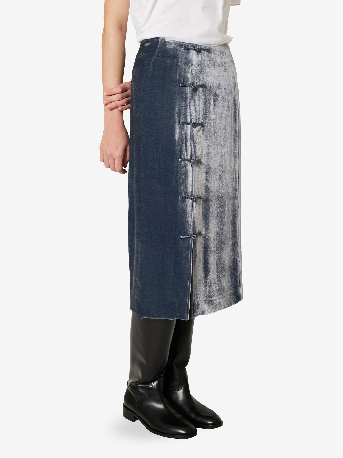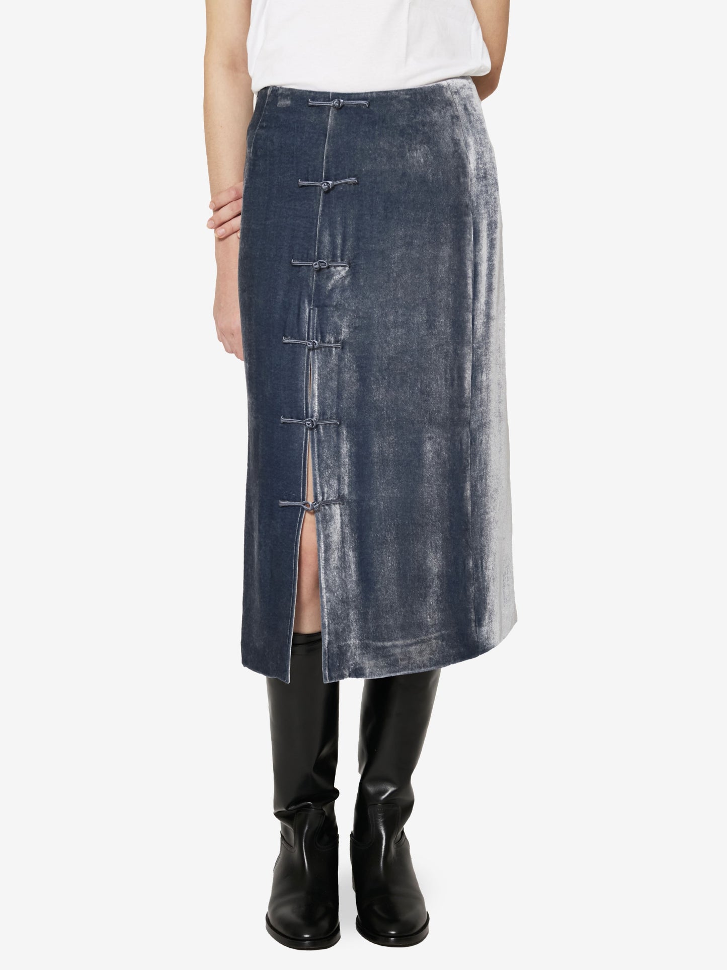 Sophisticated and timeless, this midi skirt, newly introduced into the core collection, blends the codes of past eras with a modern, refined allure. The front slit, adorned with a handcrafted frog button closure, offers a subtle yet empowering edge, inviting movement and self-expression.