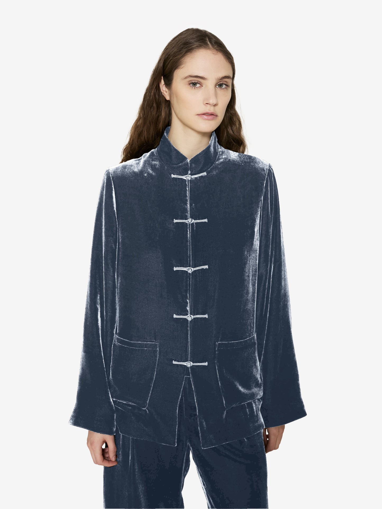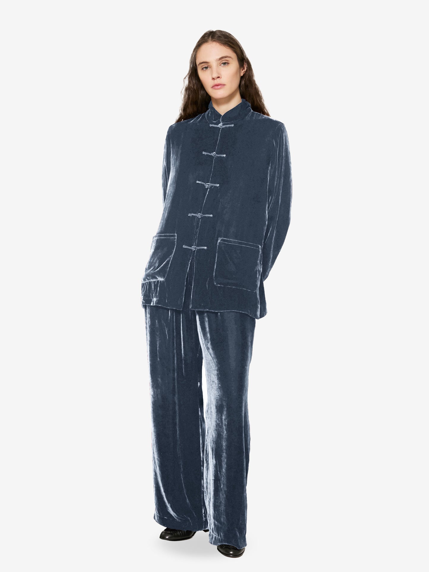 Sophisticated and timeless, this signature blazer is crafted from richly textured velvet. Featuring a handcrafted satin frog button closure, it evokes the refinement of past eras while remaining effortlessly modern.