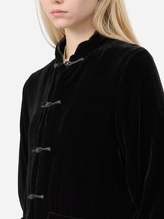 Sophisticated and timeless, this signature blazer is crafted from richly textured velvet. Featuring a handcrafted satin frog button closure, it evokes the refinement of past eras while remaining effortlessly modern.