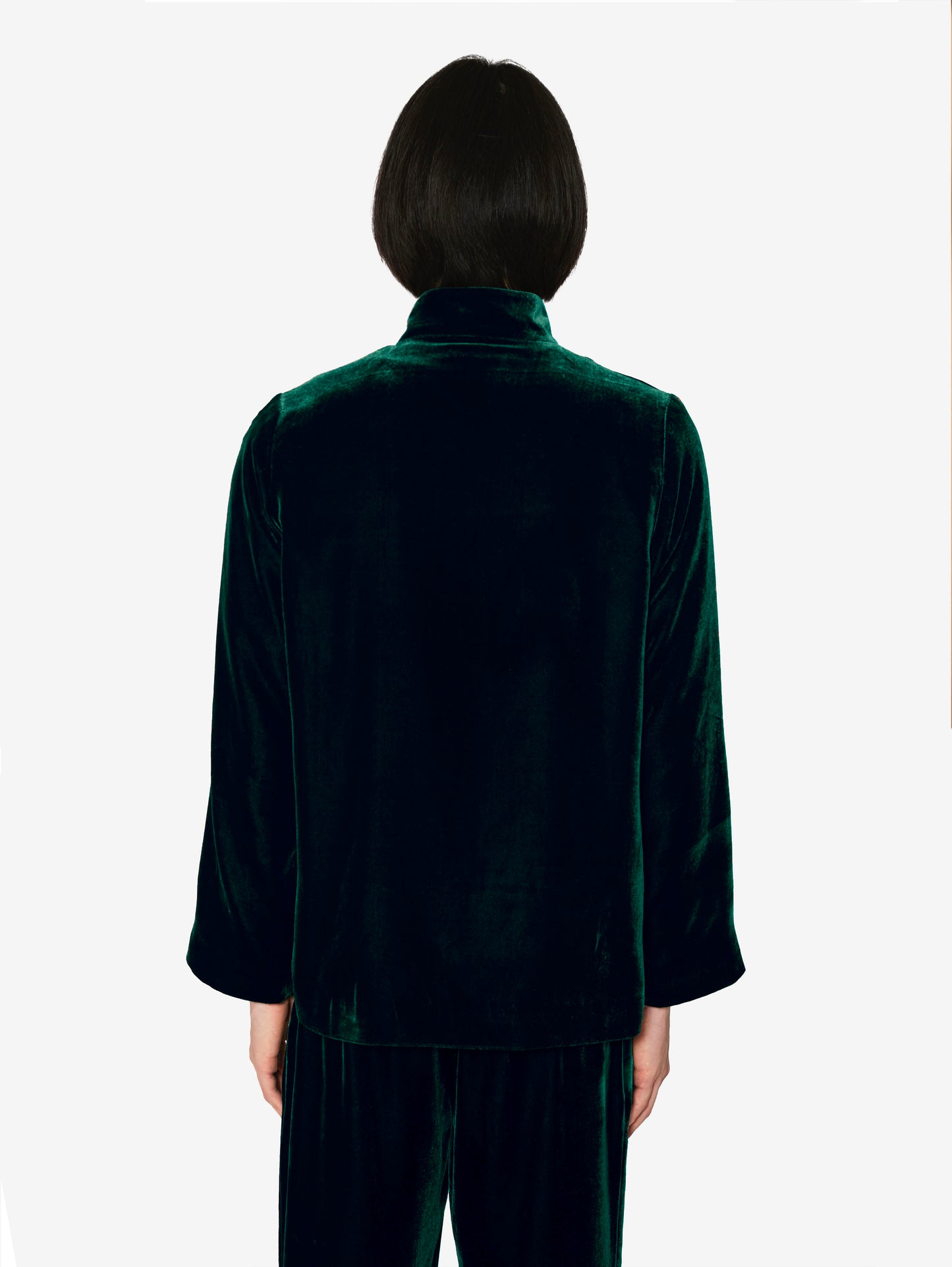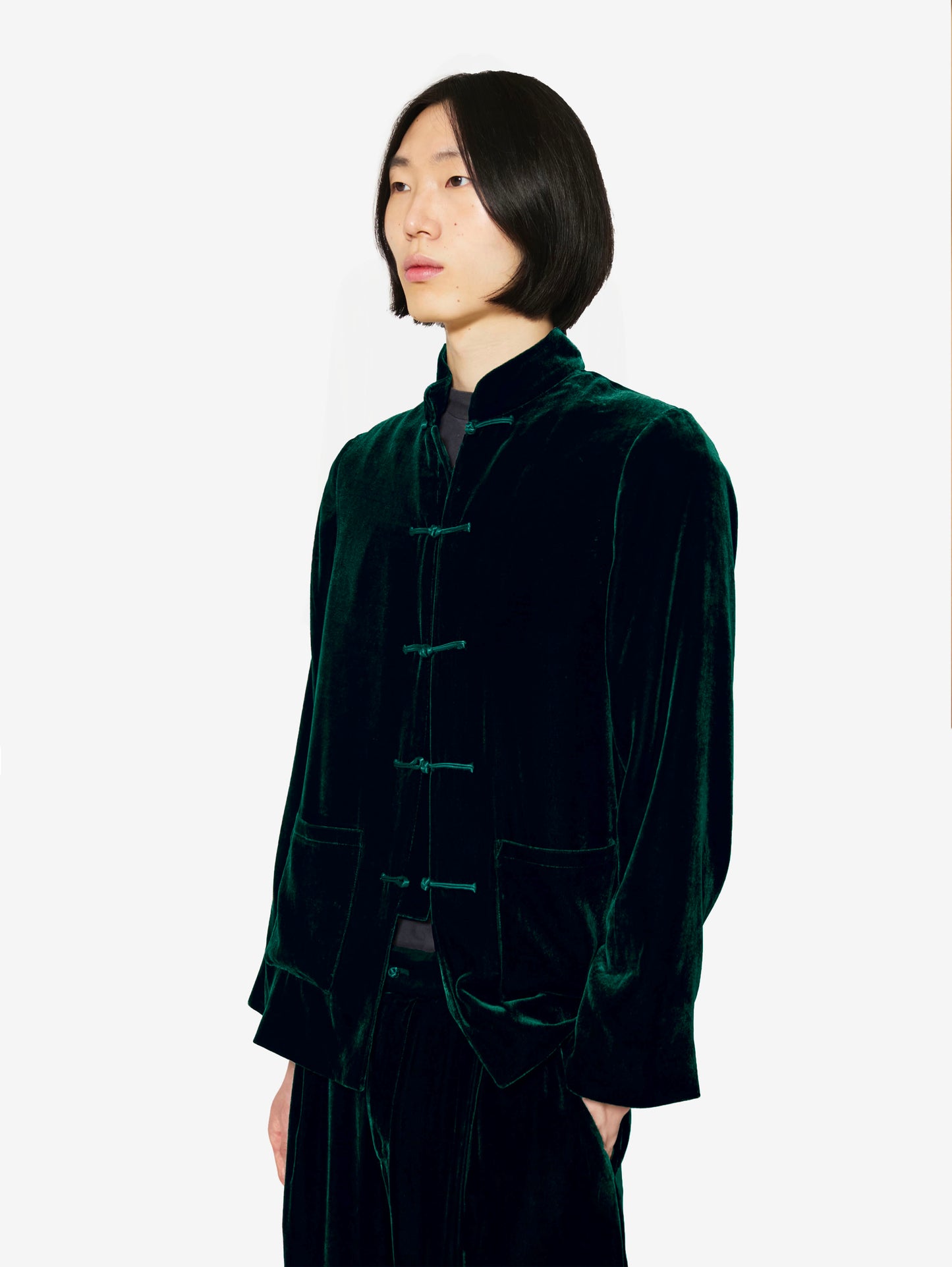 Sophisticated and timeless, this signature blazer is crafted from richly textured velvet. Featuring a handcrafted satin frog button closure, it evokes the refinement of past eras while remaining effortlessly modern.