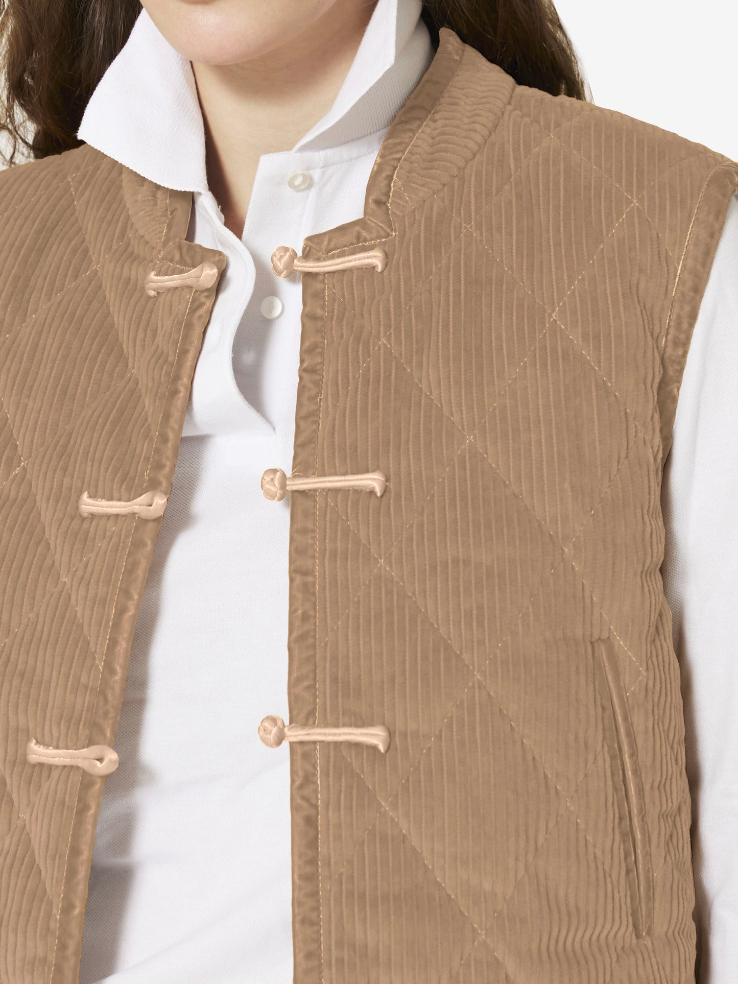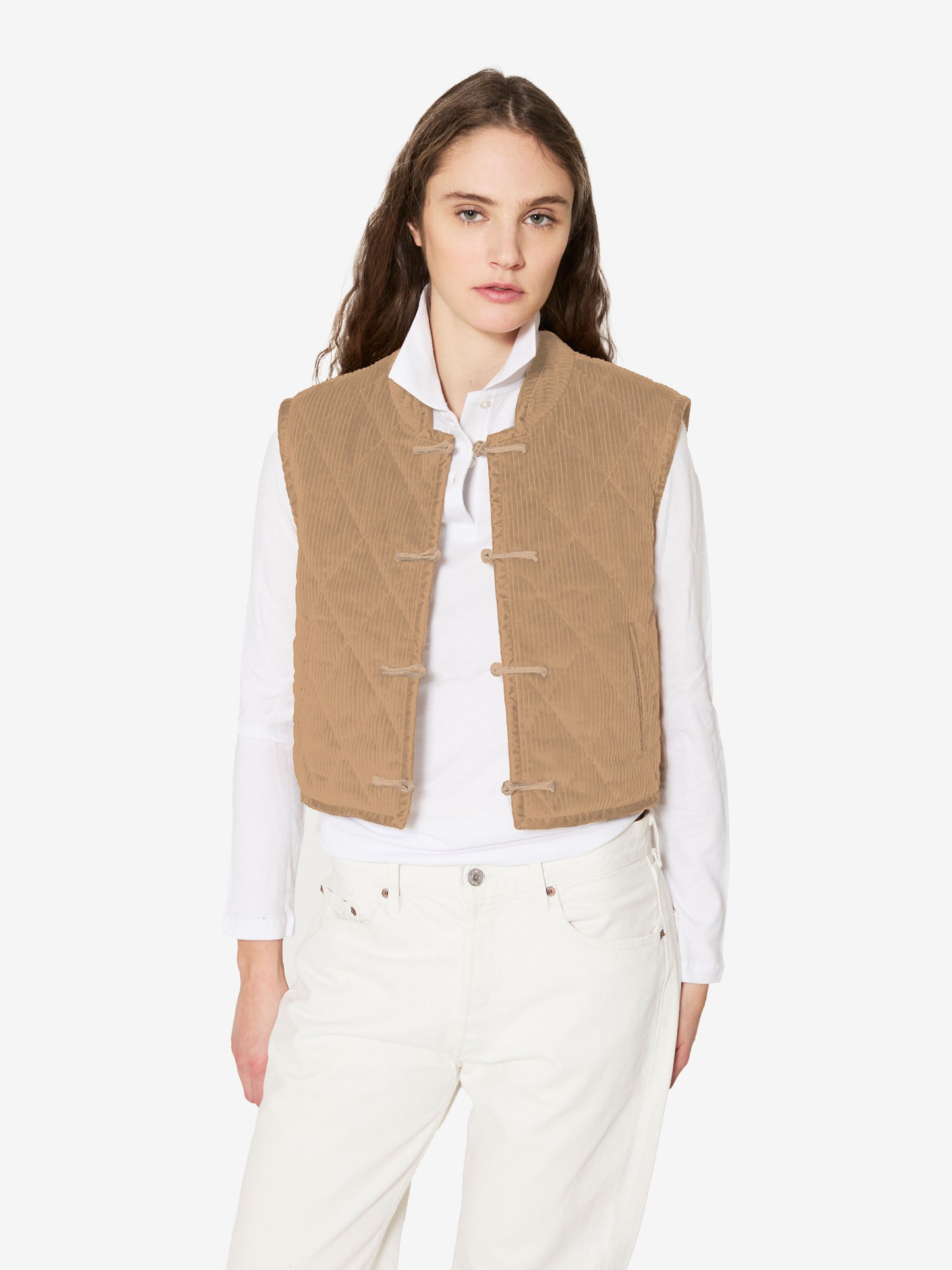 Relaxed and refined, this signature quilted vest features a handcrafted satin frog button closure and a rounded stand collar that frames the neckline with subtle structure. A cold-season essential, it can be worn over knits or layered under a coat for extra warmth.